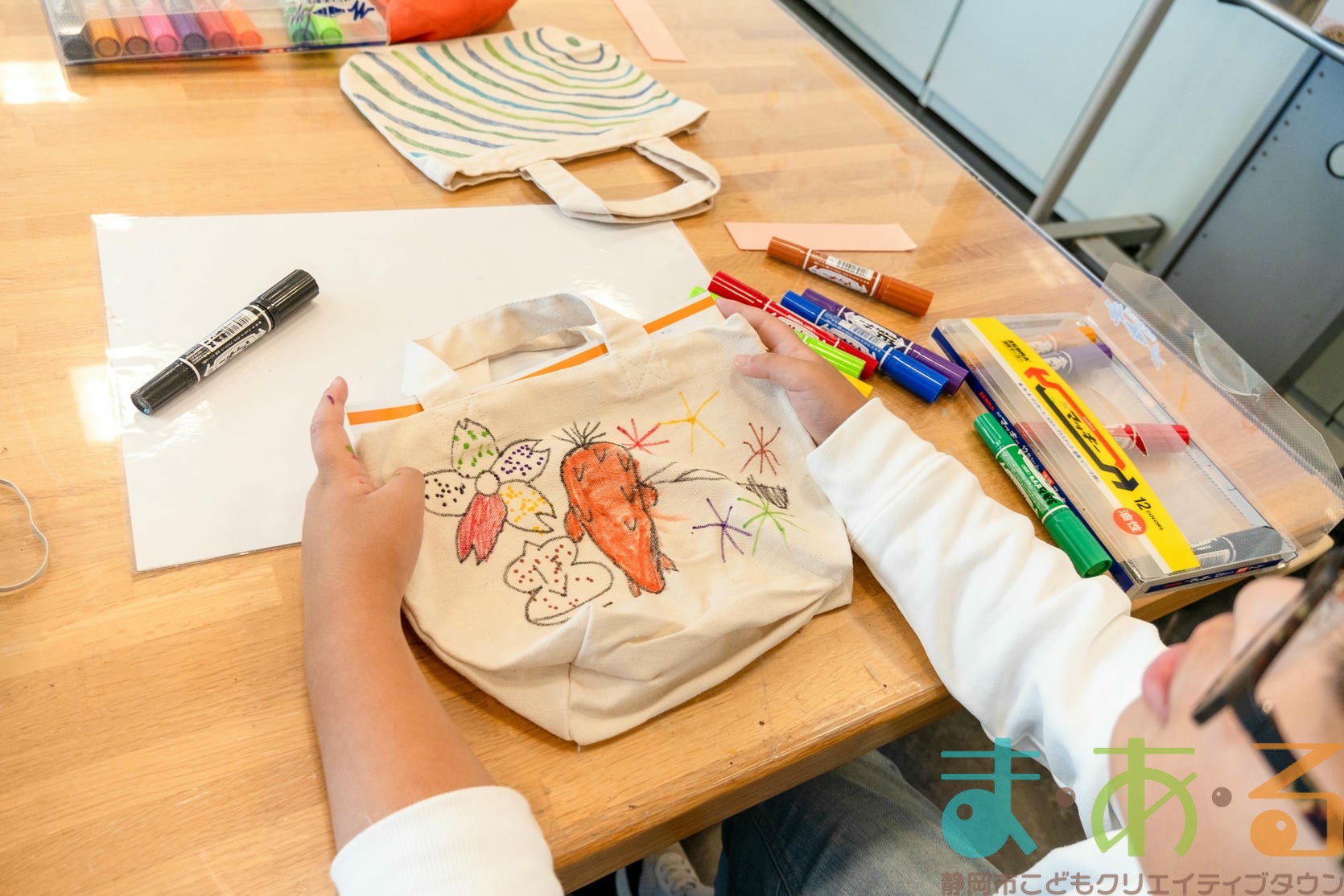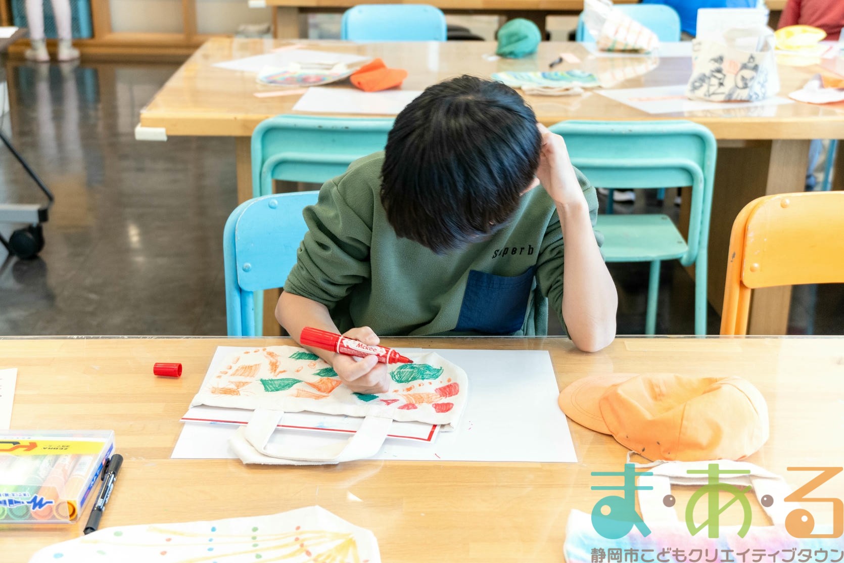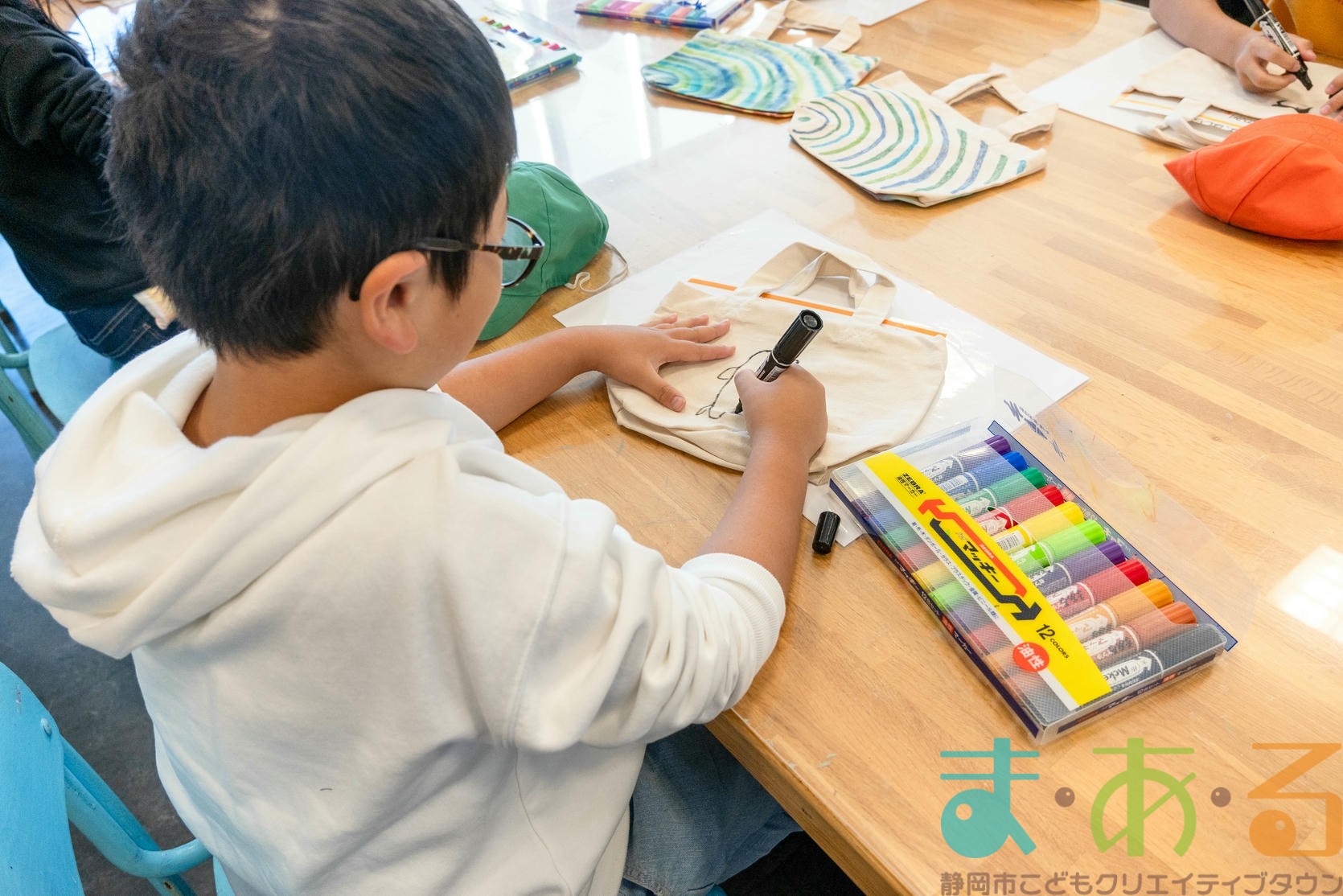 まずは、「油性ペン染めバッグづくり」です。バッグにマジックで柄や絵を描いていきます。