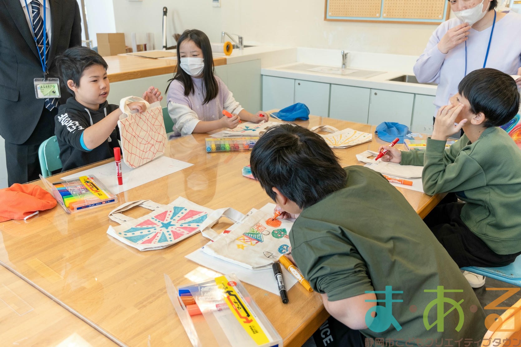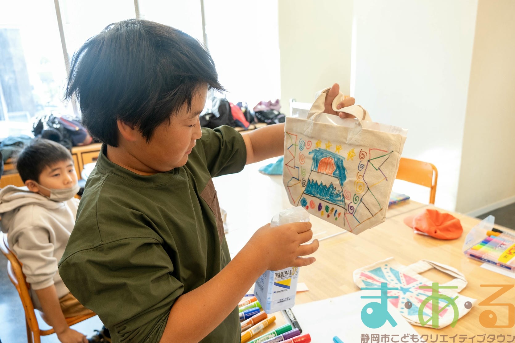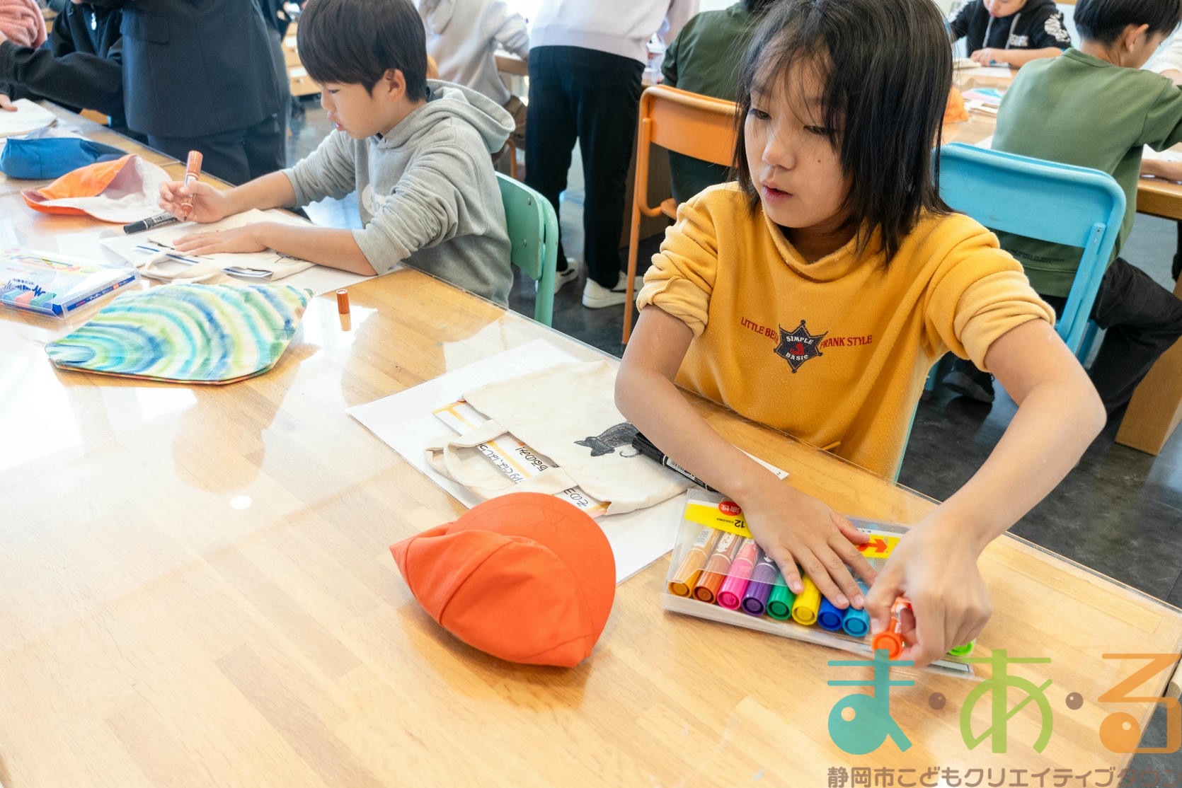 まずは、「油性ペン染めバッグづくり」です。バッグにマジックで柄や絵を描いていきます。