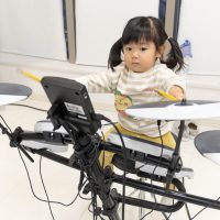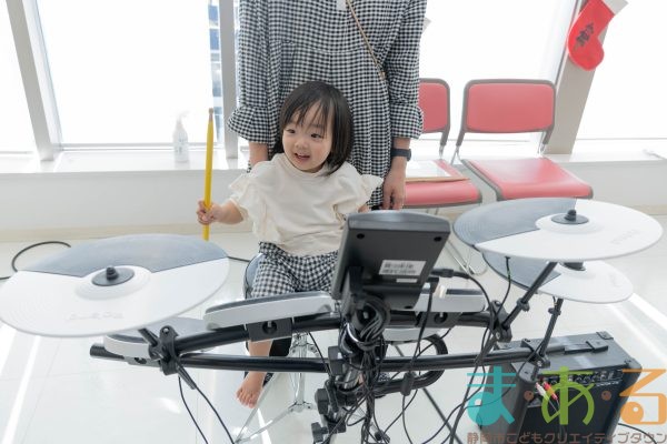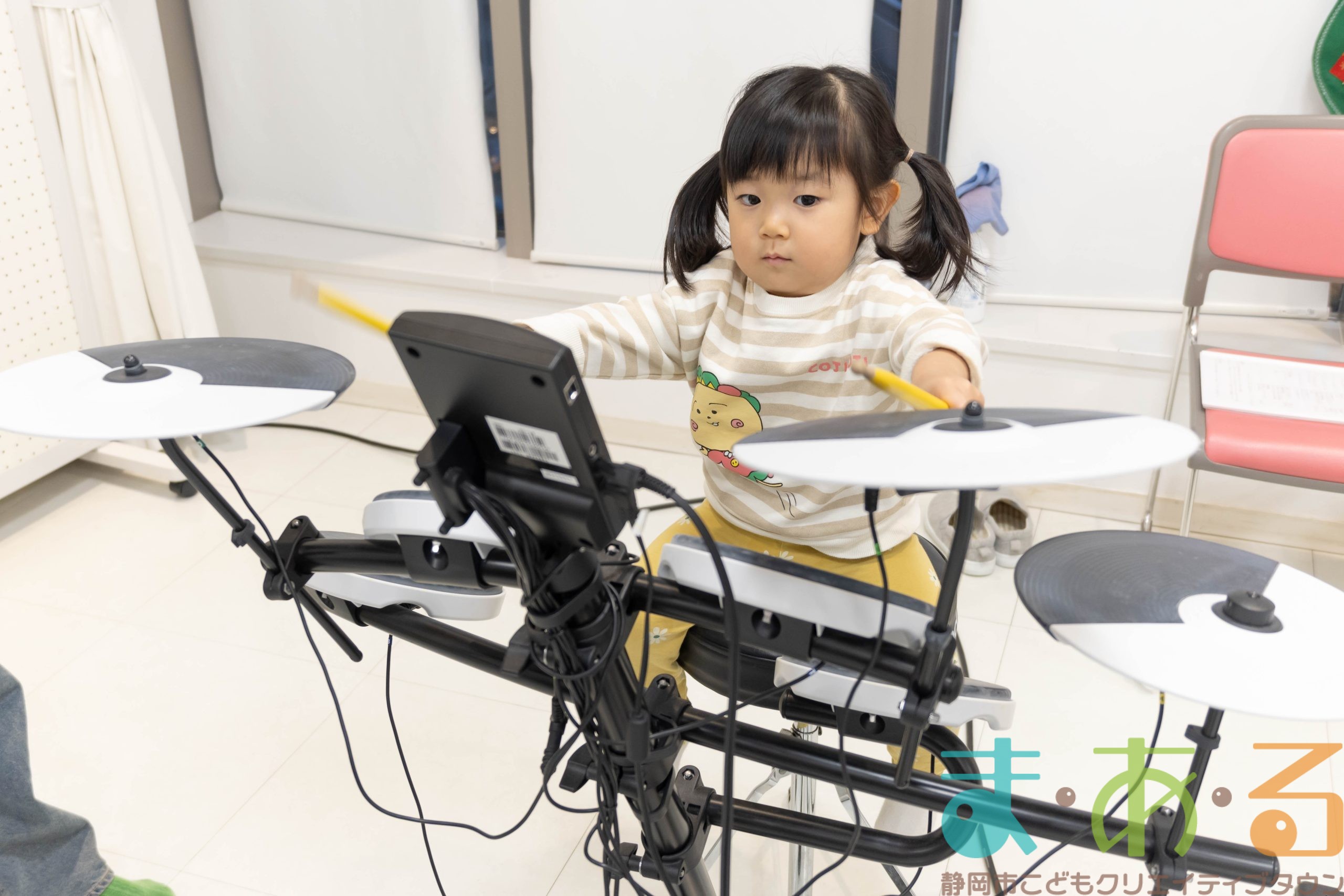 今月は、歌の『ちーちゃん』と『めいめい』、ドラムの『れいにゃん』の演奏に合わせて季節の音楽で遊びます。