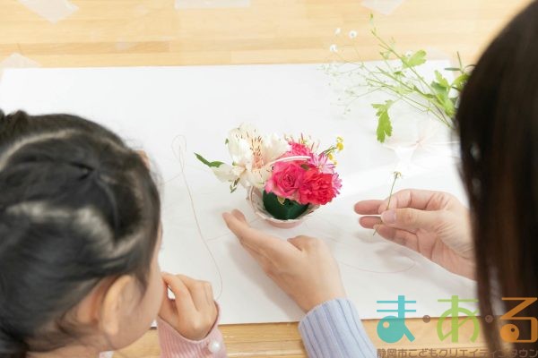 『オアシス』が見えないように、お花に高さをつけて挿すことを意識しながら親子で協力してバランスを調整しました。