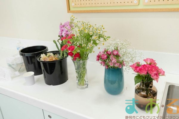 お花やさんから来た長さのあるお花も、小さくカットしたお花も、土から生えている植物もみんなと同じように生きています。