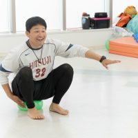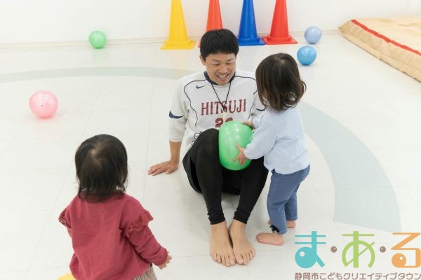 ボールの上に座ってジャンプしたり、大人チームとパワーを比べるゲームにも挑戦しました。