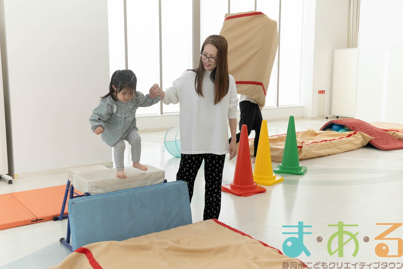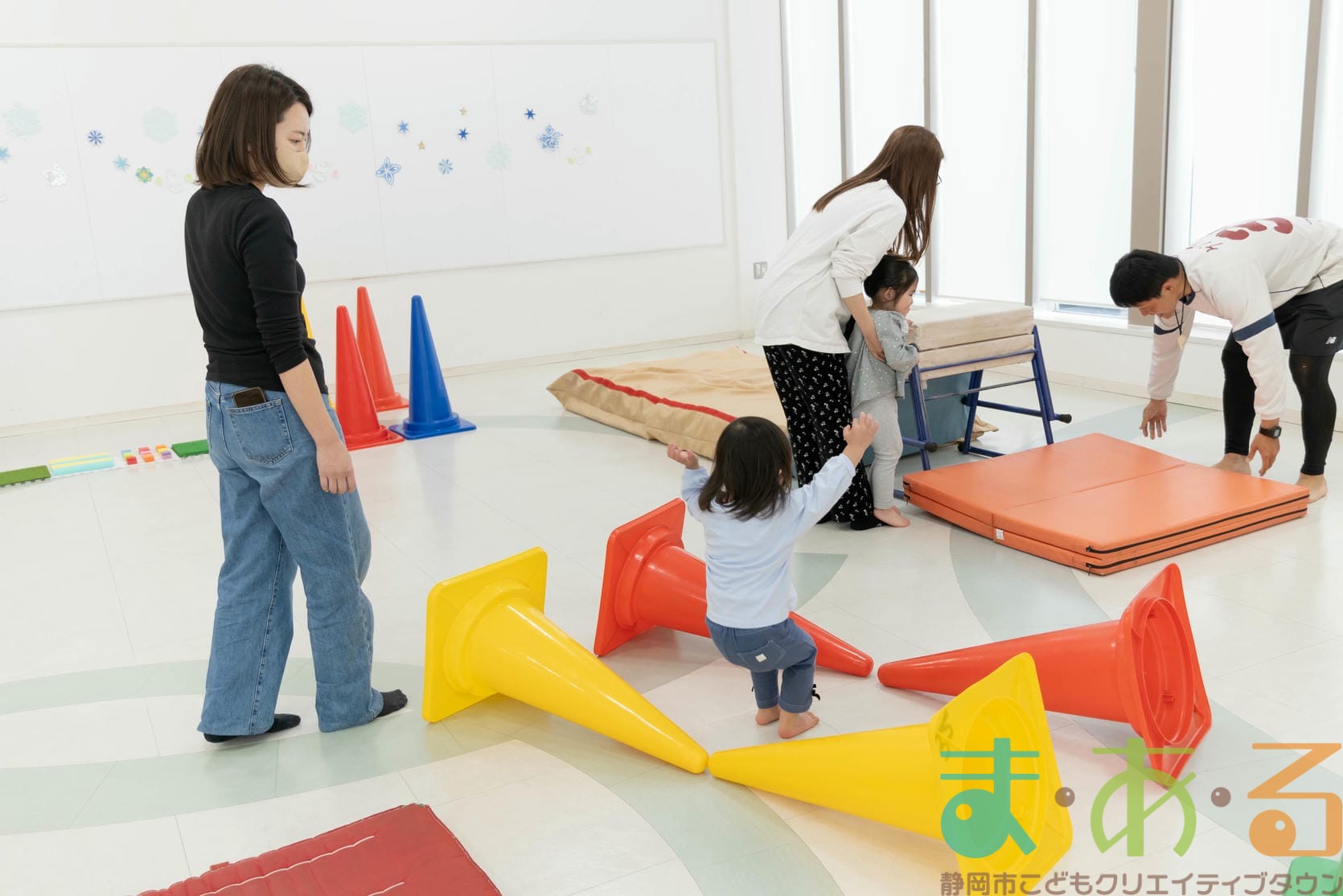 鉄棒、マット、カラーコーンなどの遊具を使用するサーキット遊びからスタート!