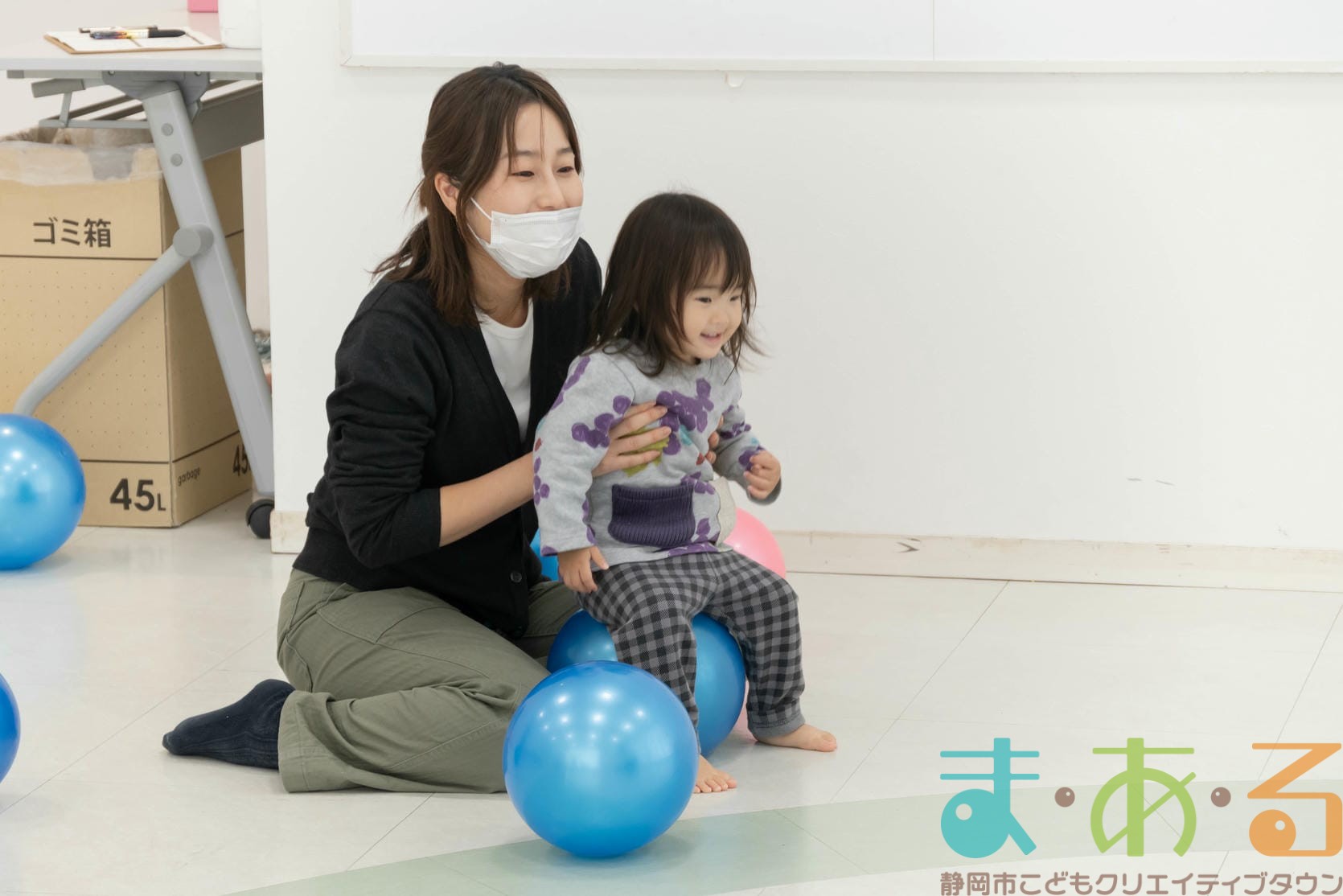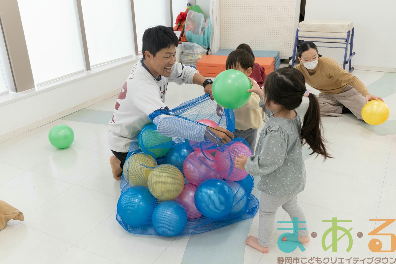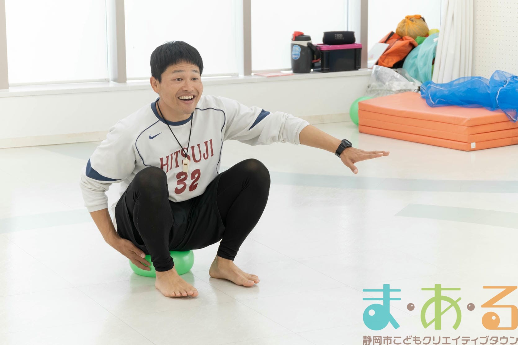 ボールの上に座ってジャンプしたり、大人チームとパワーを比べるゲームにも挑戦しました。