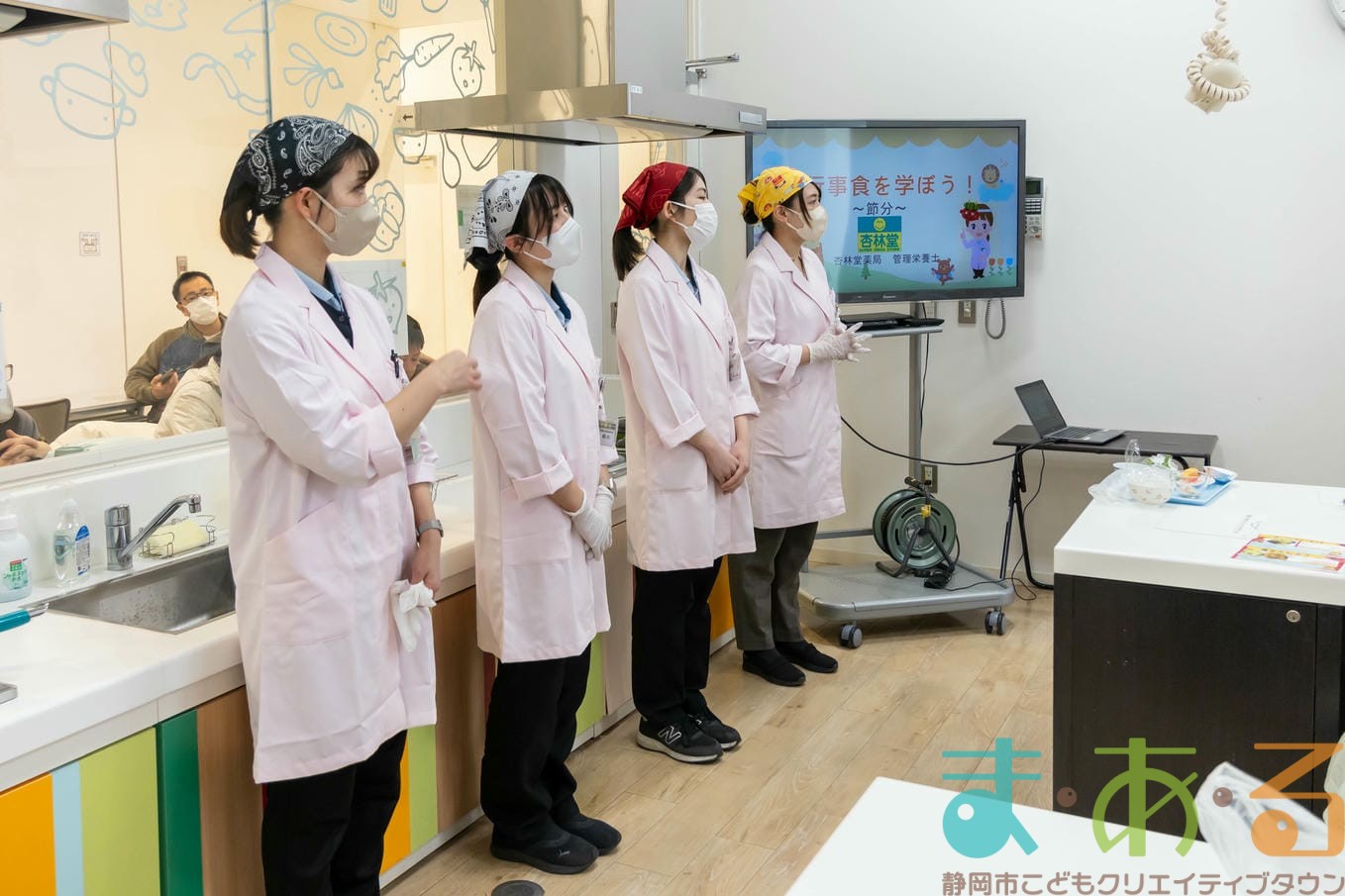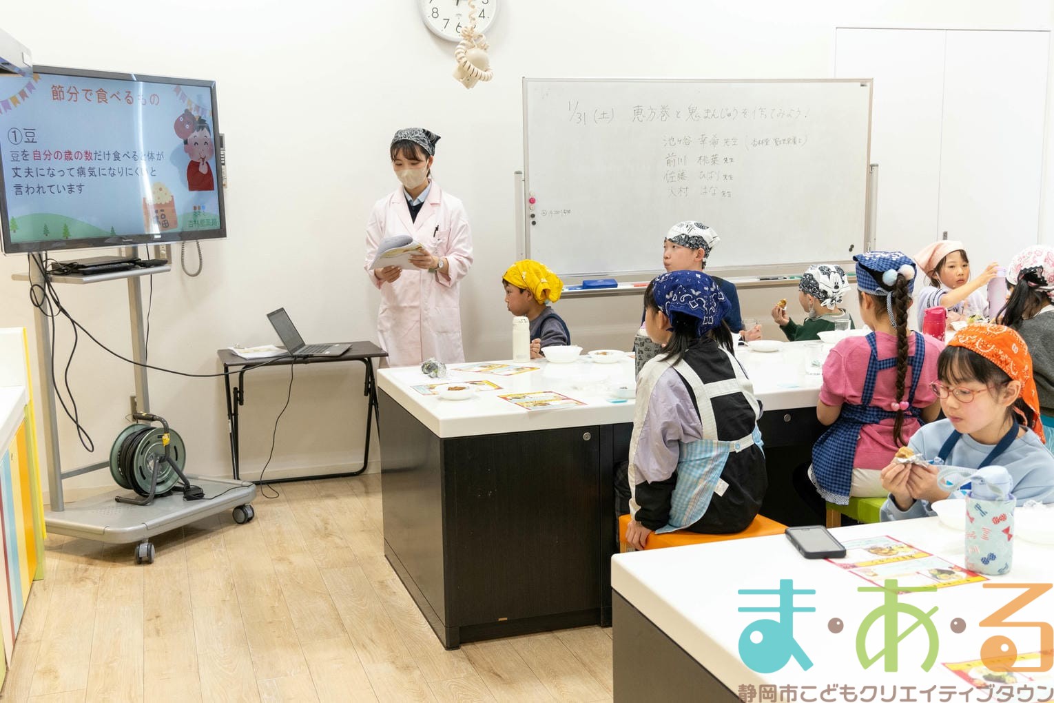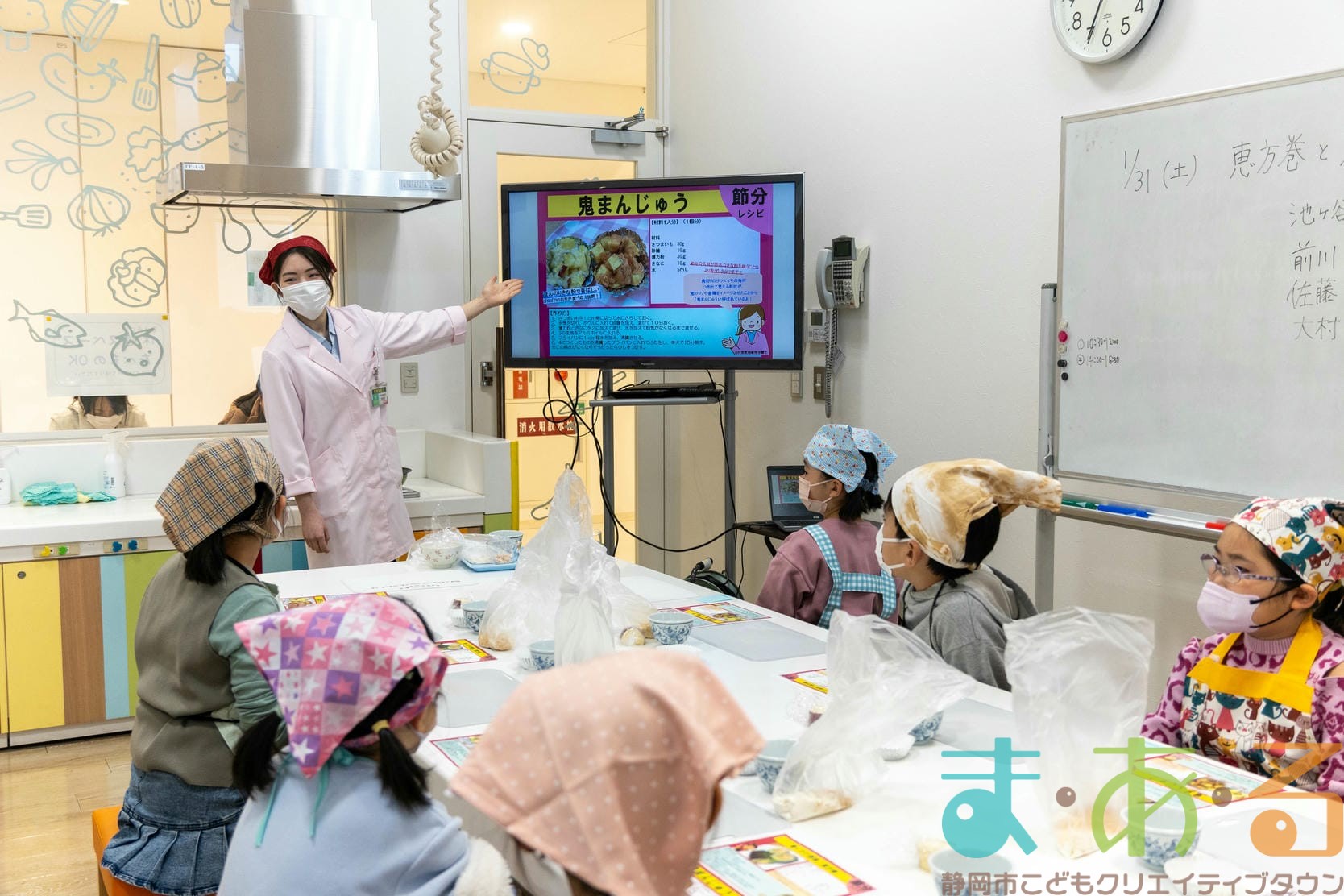 1月31日は、株式会社杏林堂薬局 管理栄養士の池ヶ谷先生、前川先生、佐藤先生、大村先生にご協力いただき、「恵方巻と鬼まんじゅうを作ってみよう!」講座を開催しました。