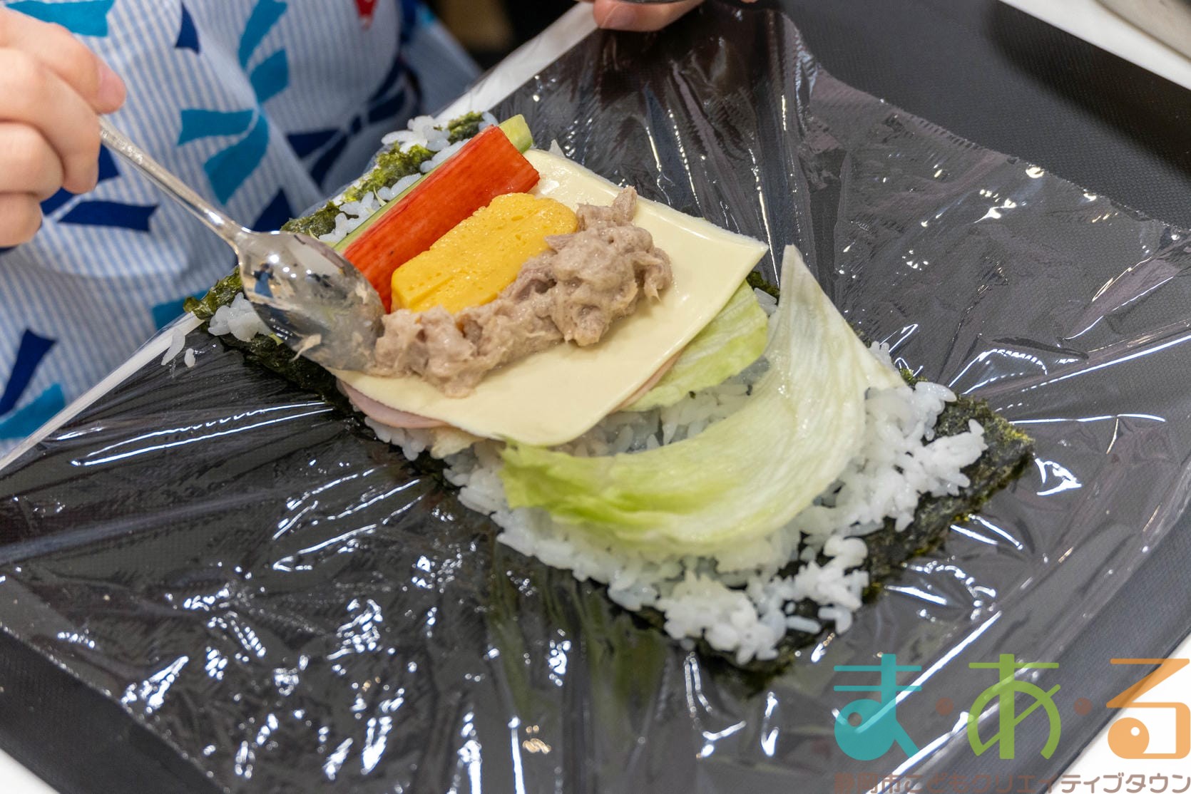 盛りだくさんの具材がのったら、手前からラップと海苔を一緒に巻いていきます。