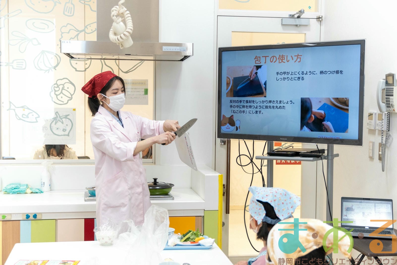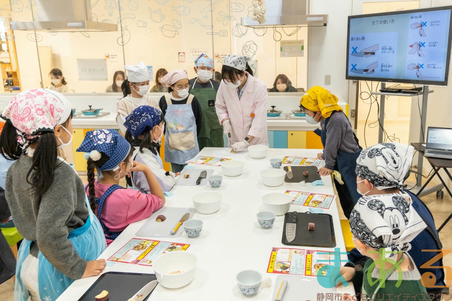 先生のデモンストレーションをしっかり見て、安全に包丁が使えるように教えていただきました。