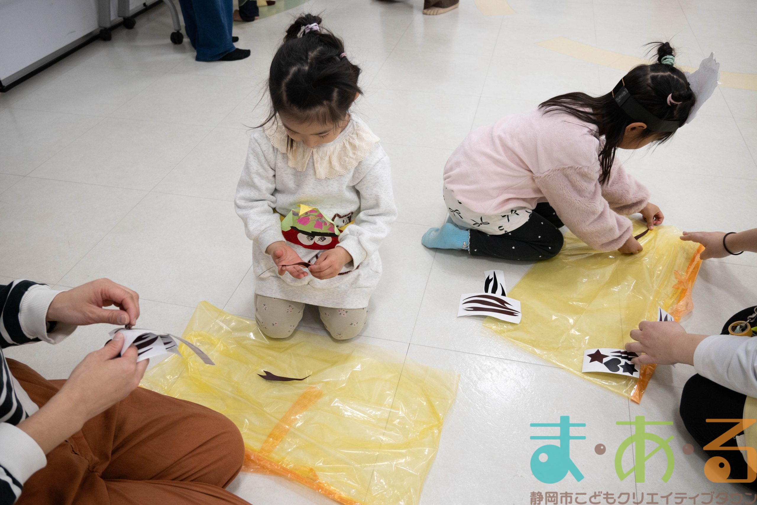 黄色のスカートとパンツから好きなほうを選んでもらい、そこに虎柄のシールをペタペタ貼って「鬼のパンツ」や「鬼のスカート」を作ります。