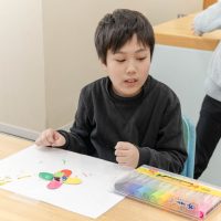 最初に2グループに分かれて商品作りを行いました。「牛乳パックコマ」と「カラフルしおり」を作りました。