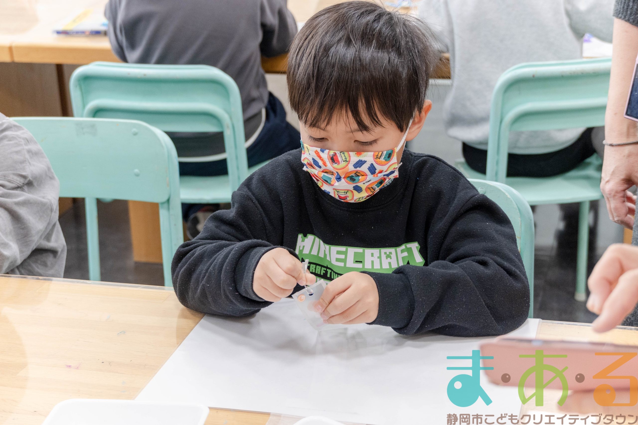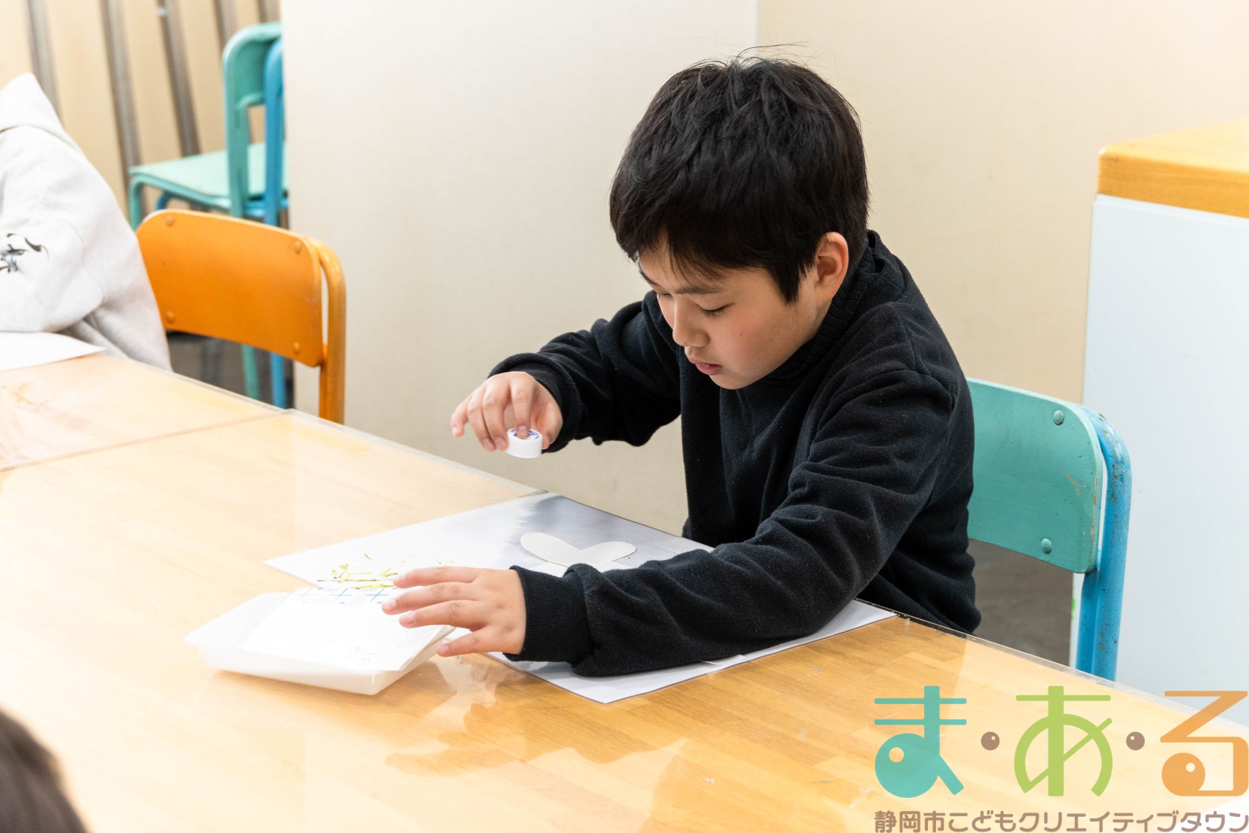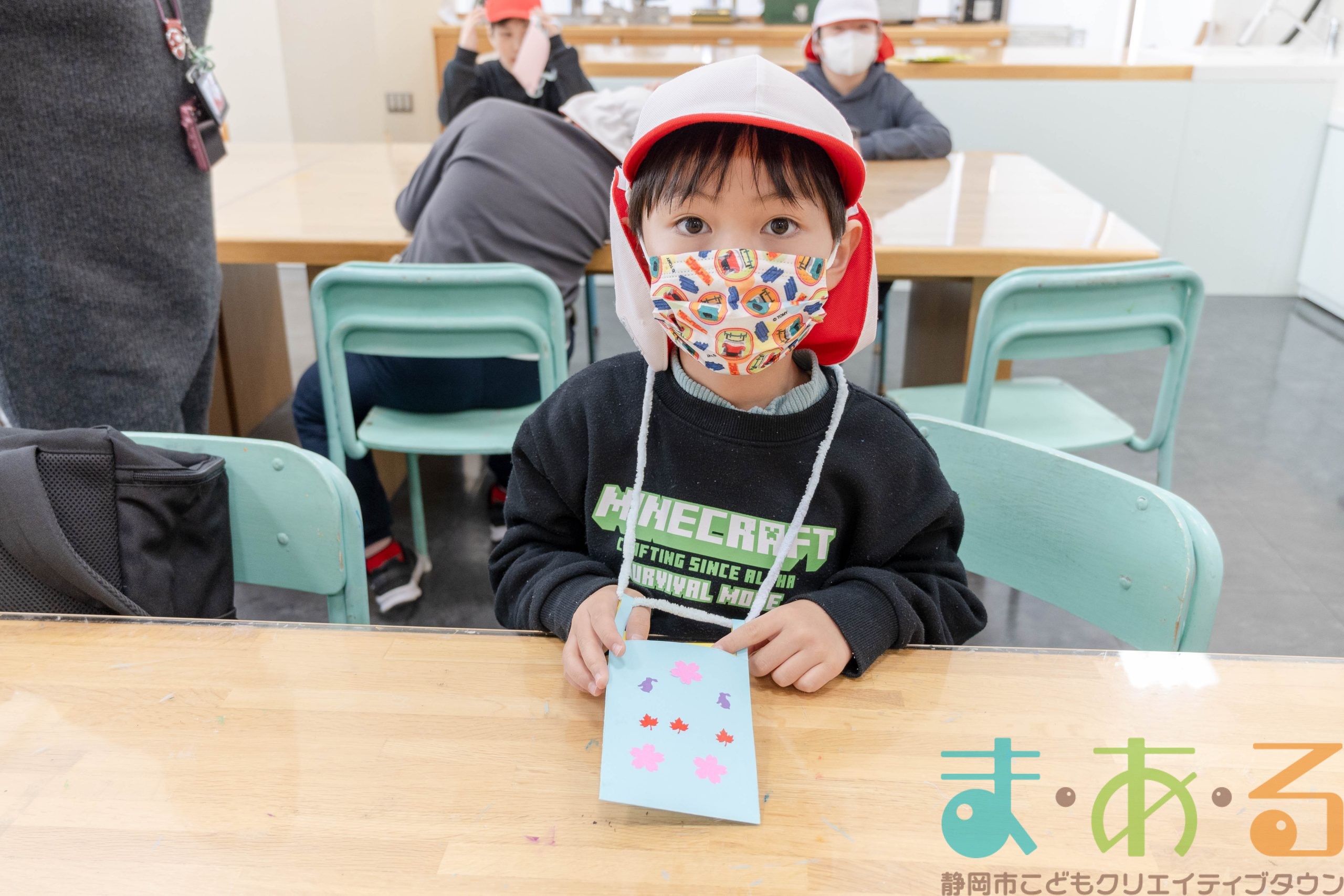 最後に両面テープで固定したら完成です。どちらのグループも商品が完成したので、お店に商品を納品して後半は、おかいもの体験です。