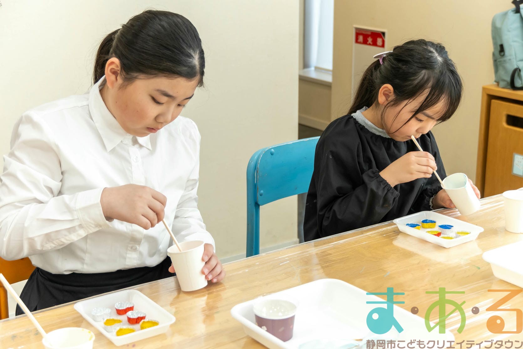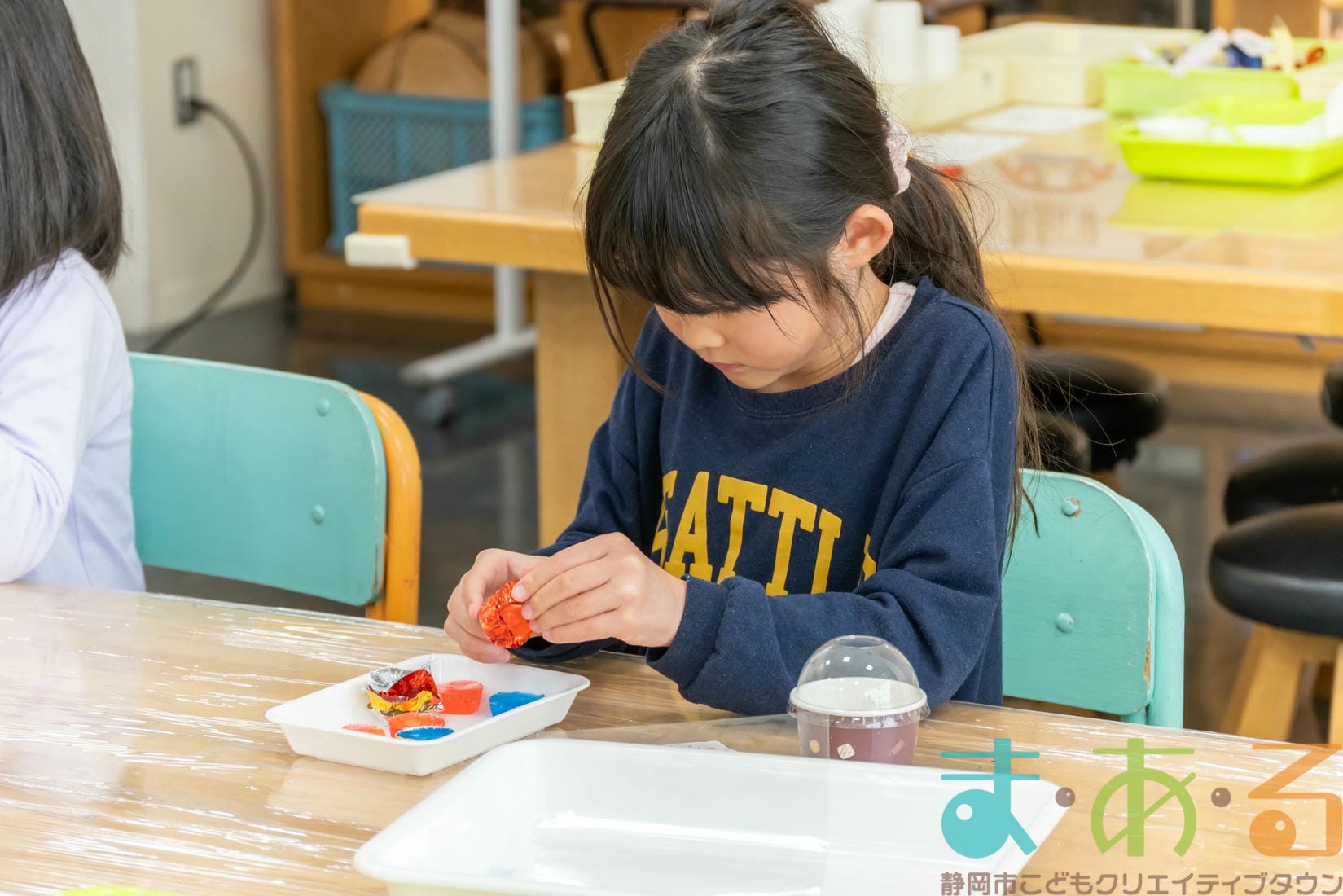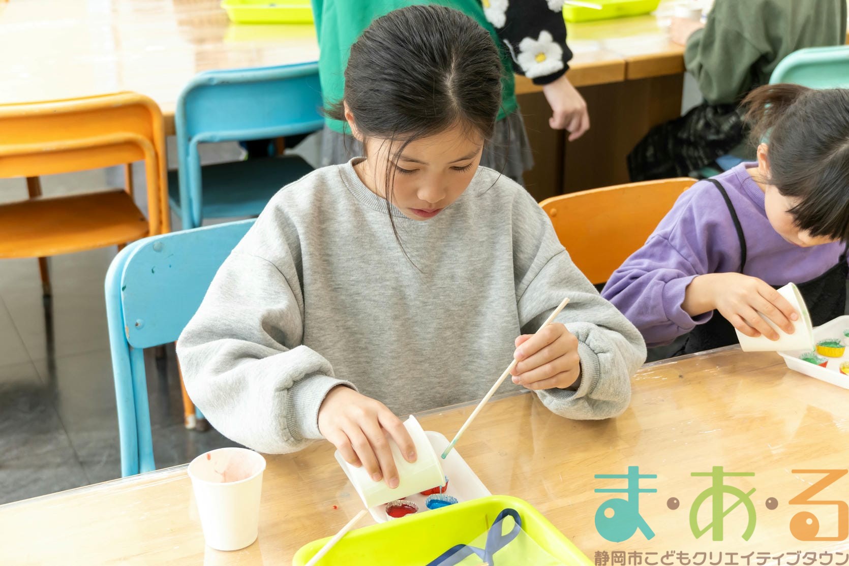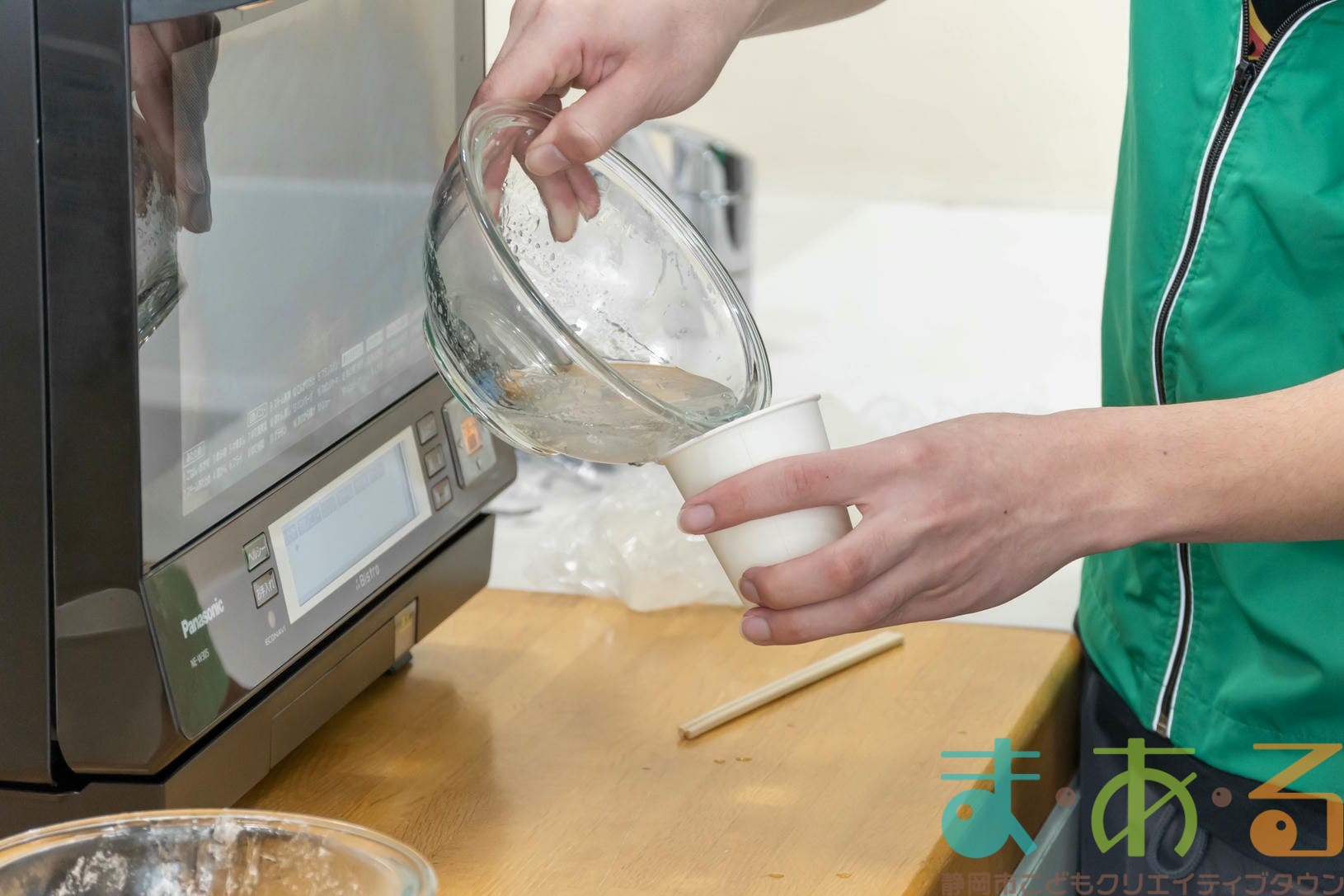 そのあと、割り箸を使って、グリセリンソープと色を混ぜ合わせます。