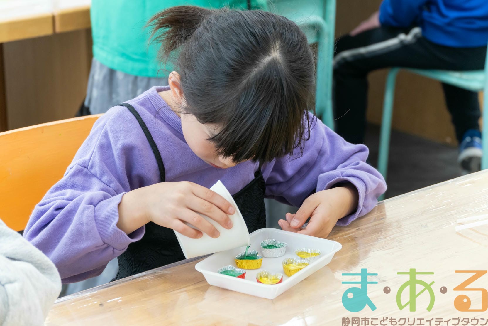 溶けたグリセリンソープに、赤、青、緑、黄色の中から好きな色の着色料を入れます。