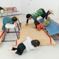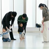 腕の力やお腹の力を使って自分で起き上がれるように大人の皆さんがサポートします。