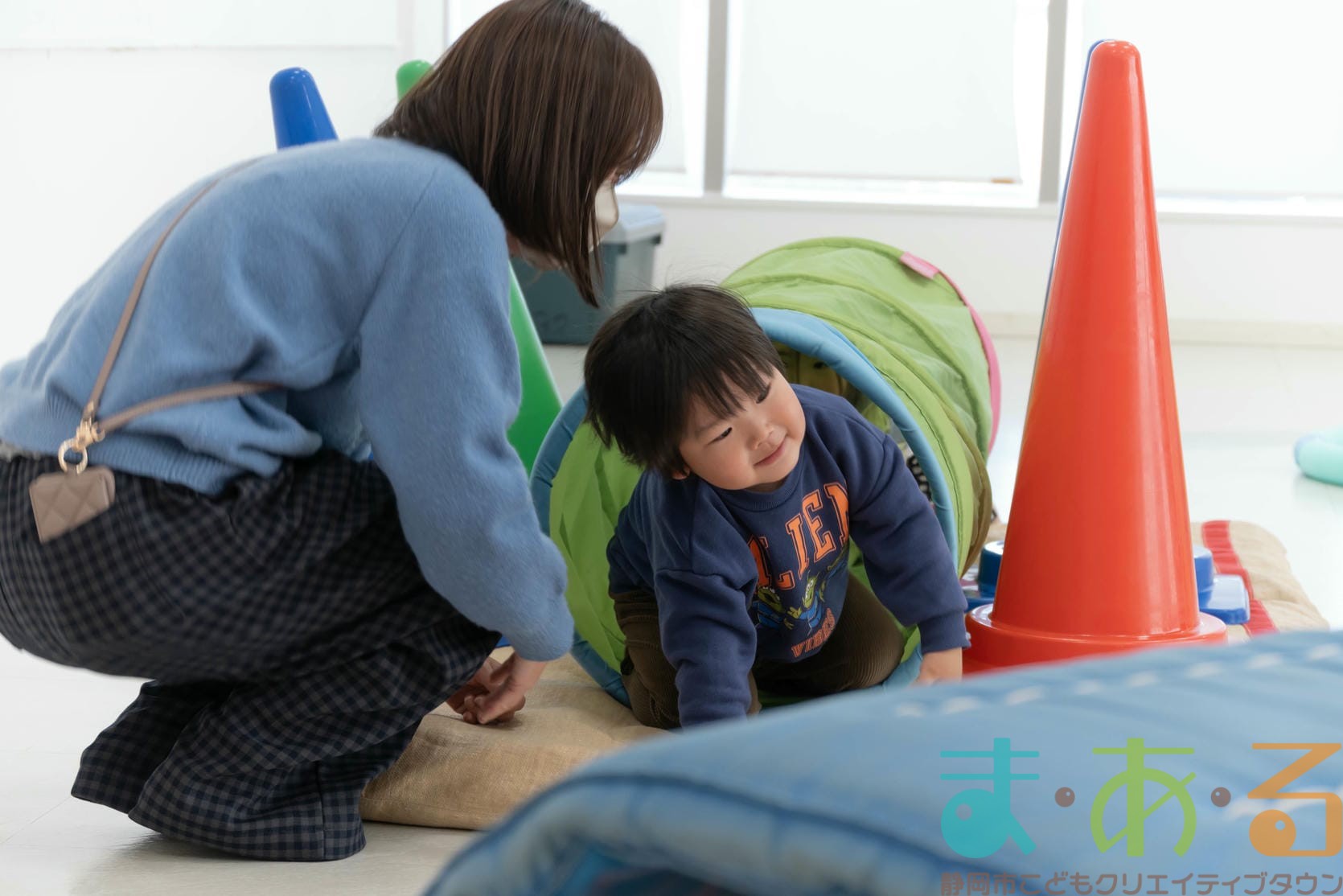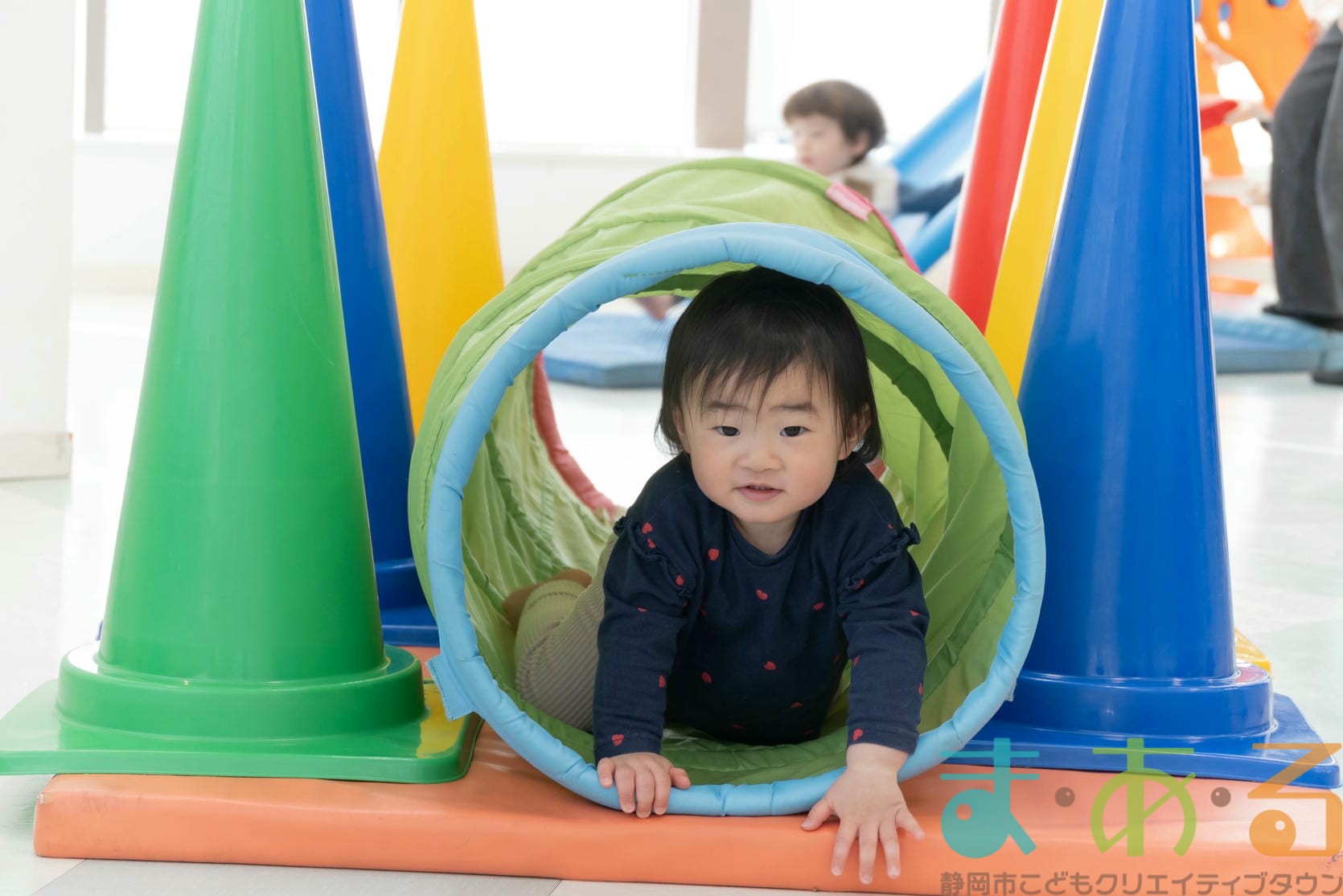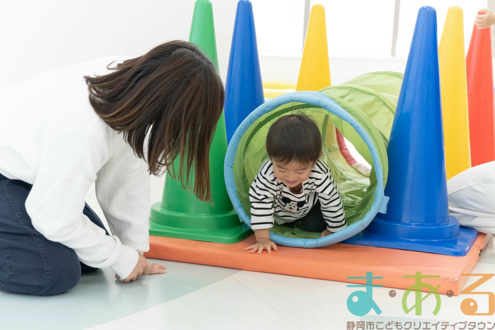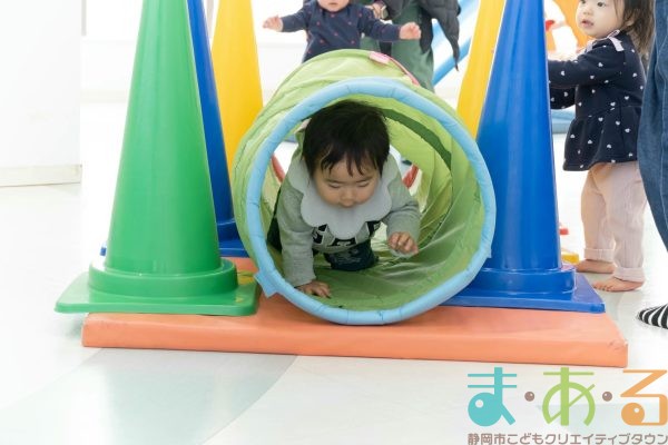 徒手遊びでは手の力を使って身体を前に運び、足のトンネルを進みます。