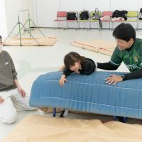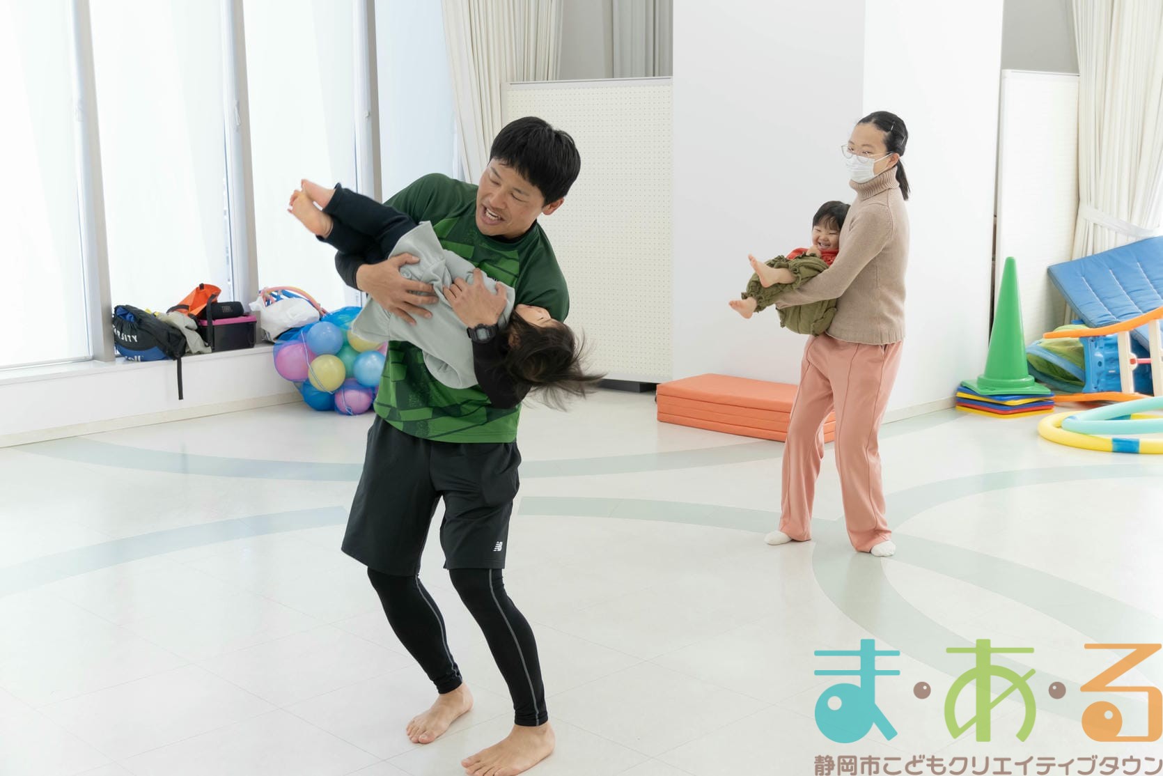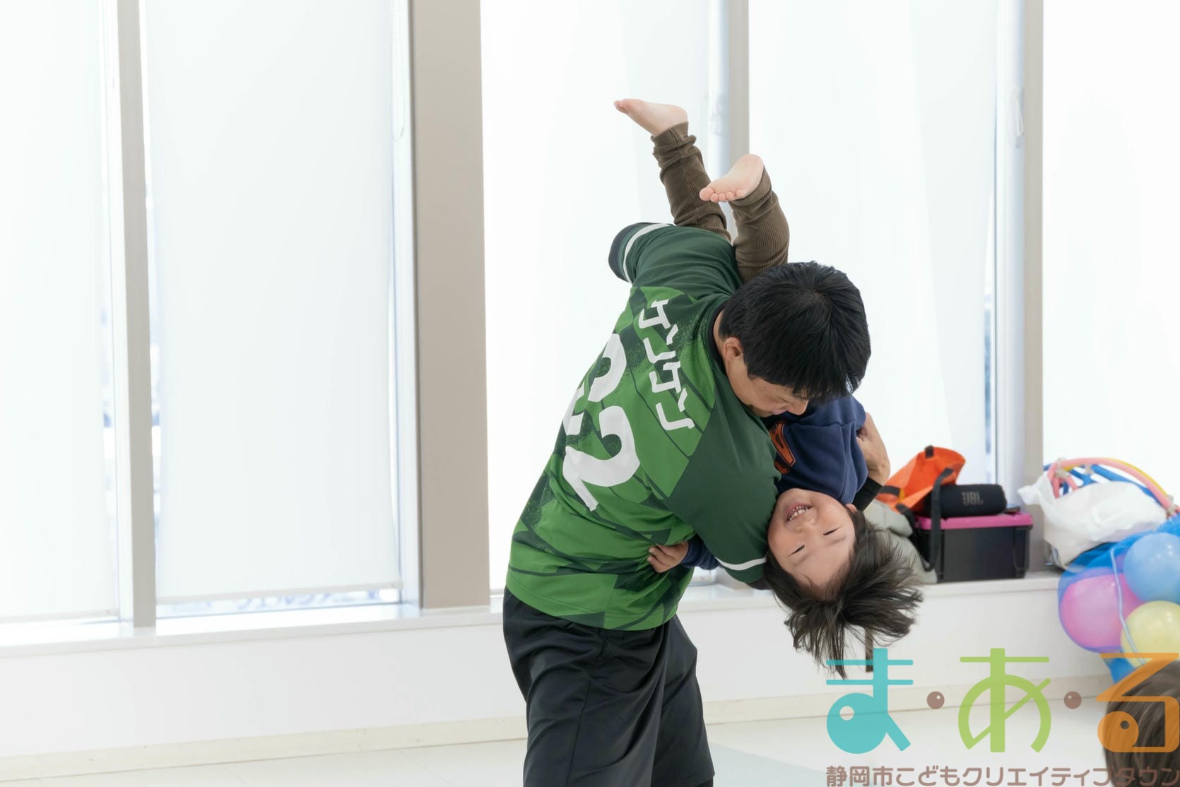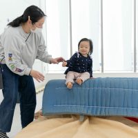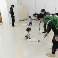 逆さま遊びでは、抱っこの状態から身体を倒して頭が下になる姿勢を体験してみました。