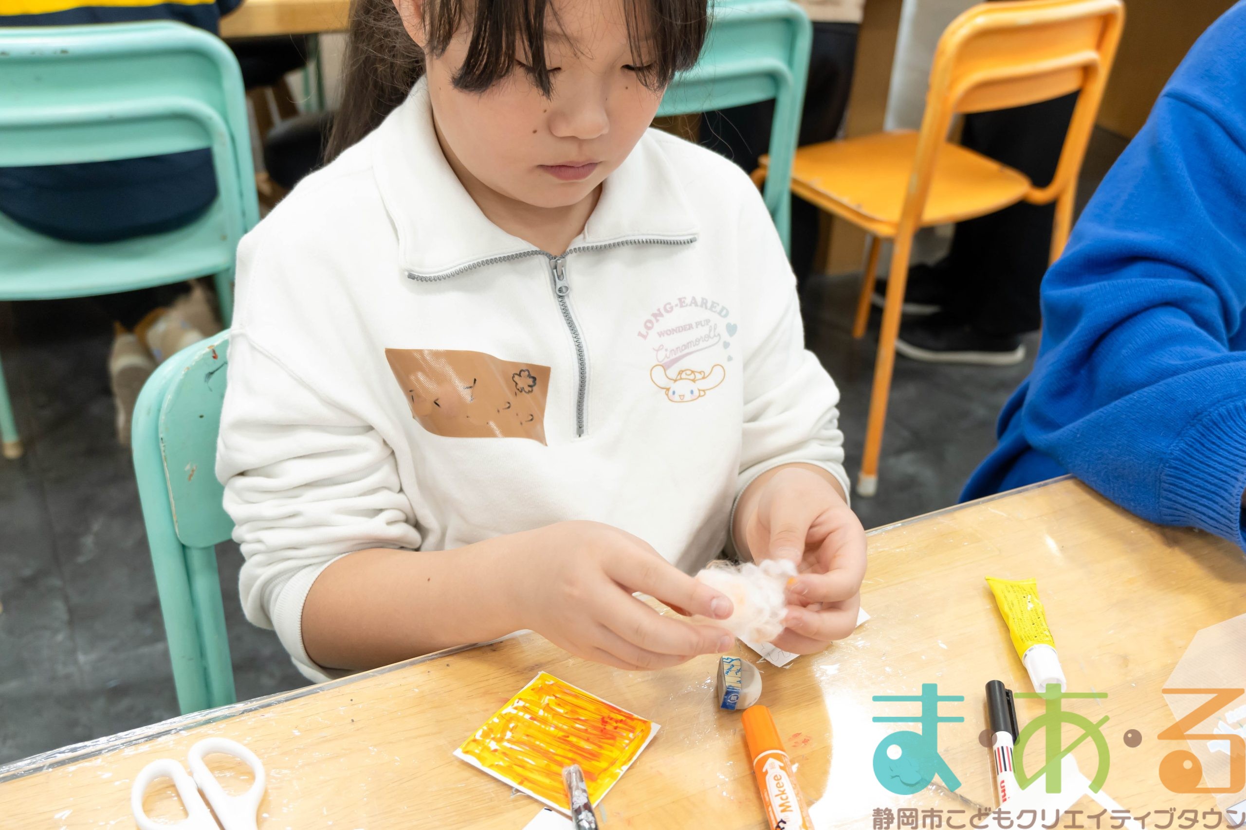 「夕焼けの表現にしたい!」綿を雲に見立てて、オレンジ色のマーカを使って綿に色を付けることを思いつきました。