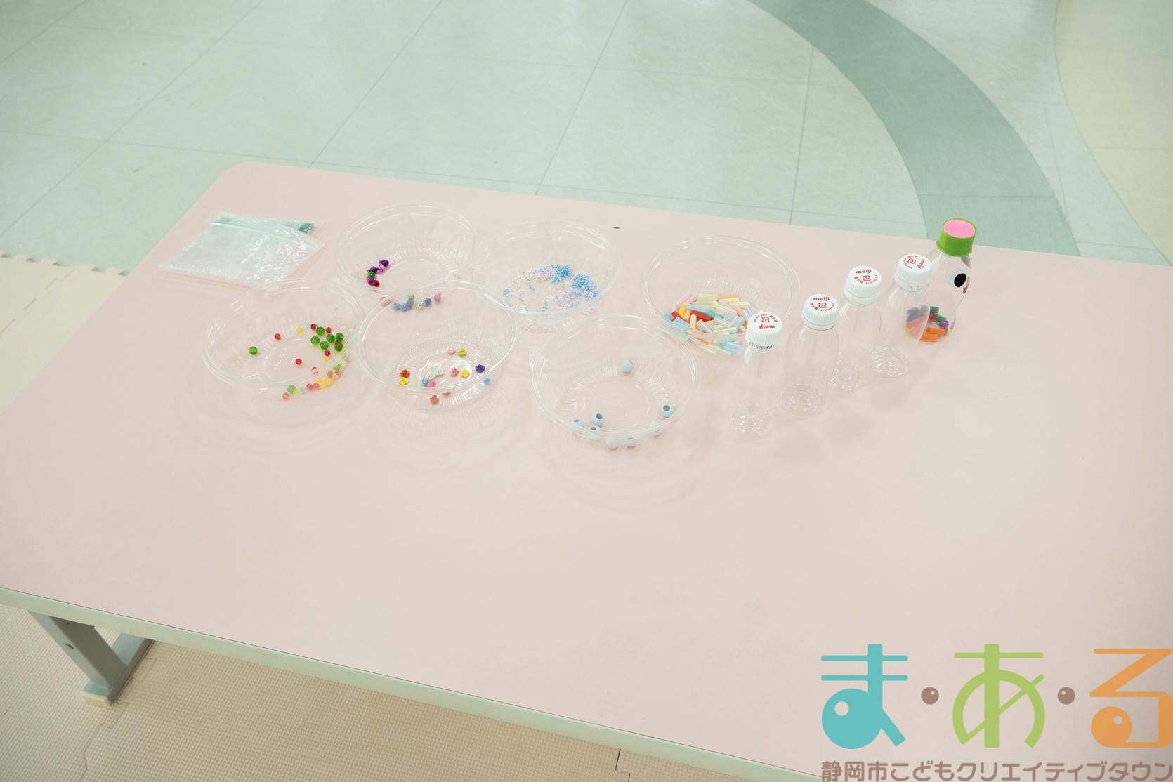 小さいペットボトルの中に、ビーズやストローの切れ端を入れて、オリジナルマラカスを作ります。