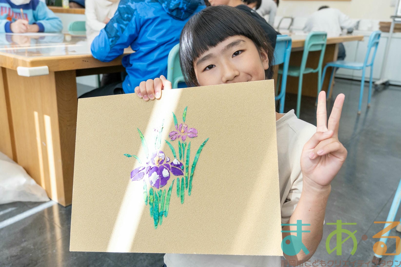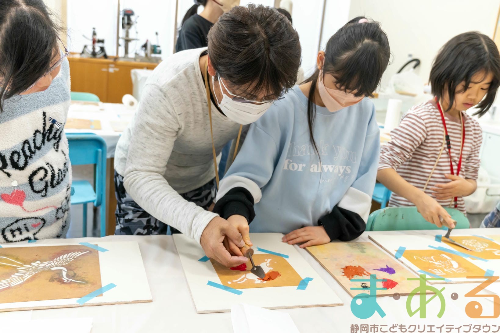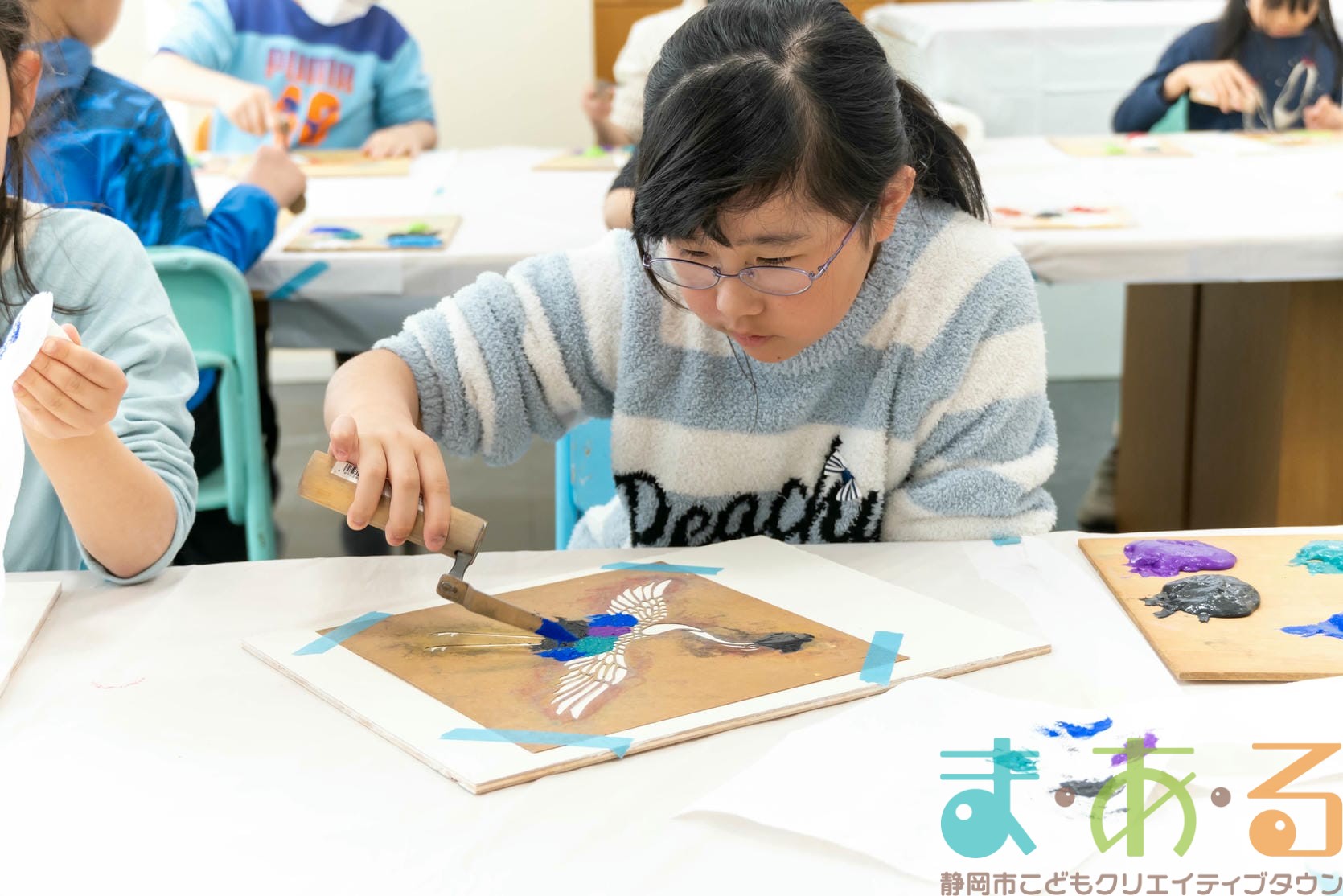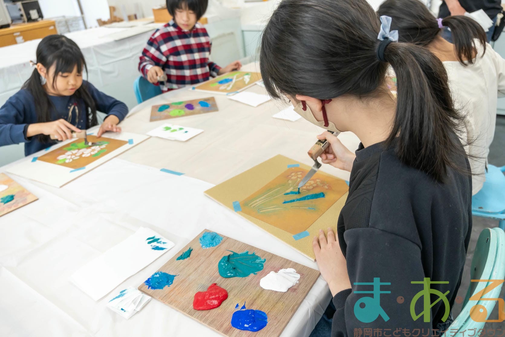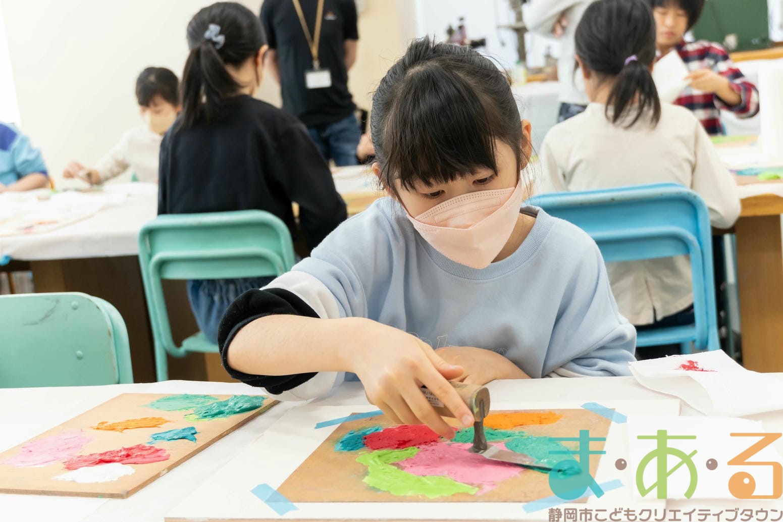 「思っていたより重いね」「ざらざらしてるね、砂が入っているのが分かる!」と、みなさん絵の具との違いも学ぶことができました。