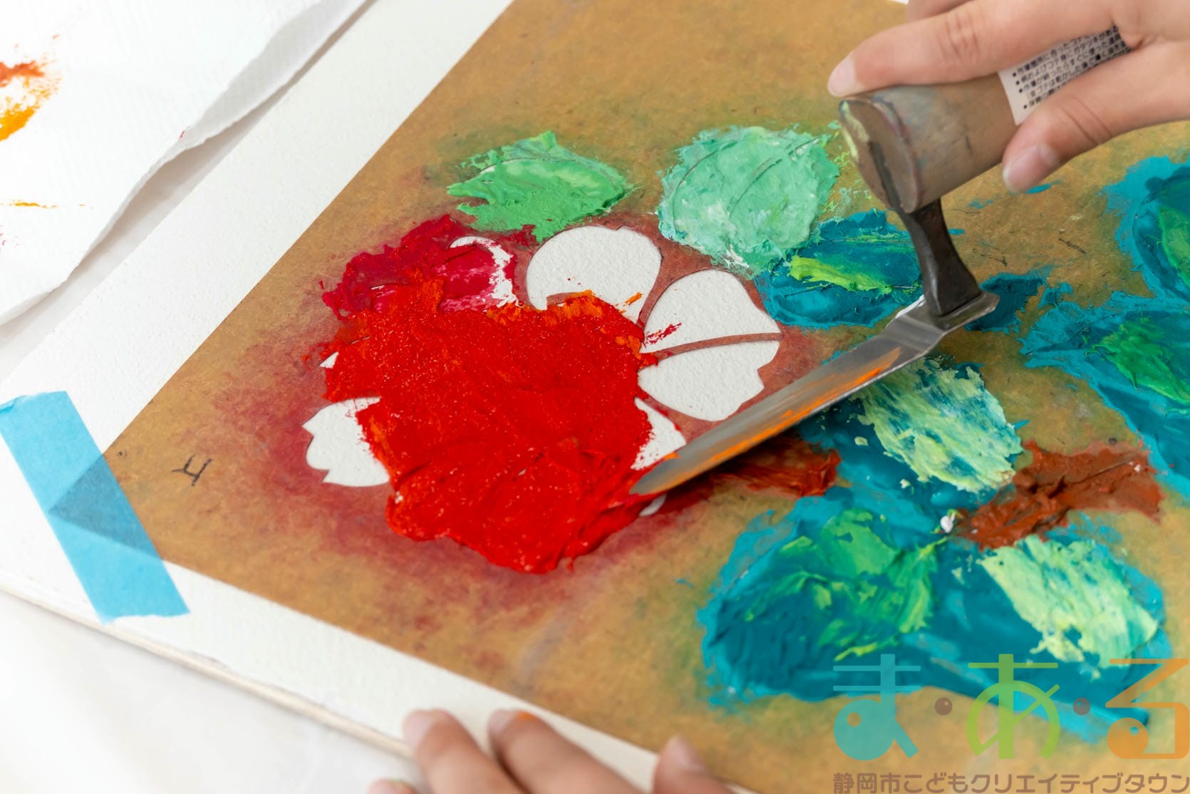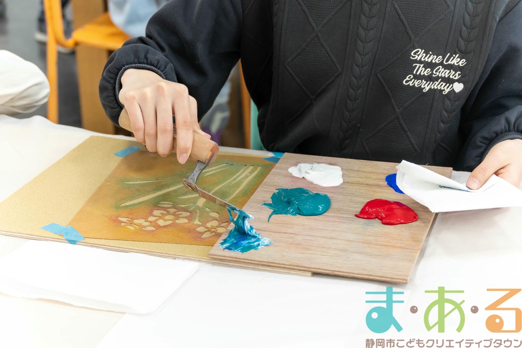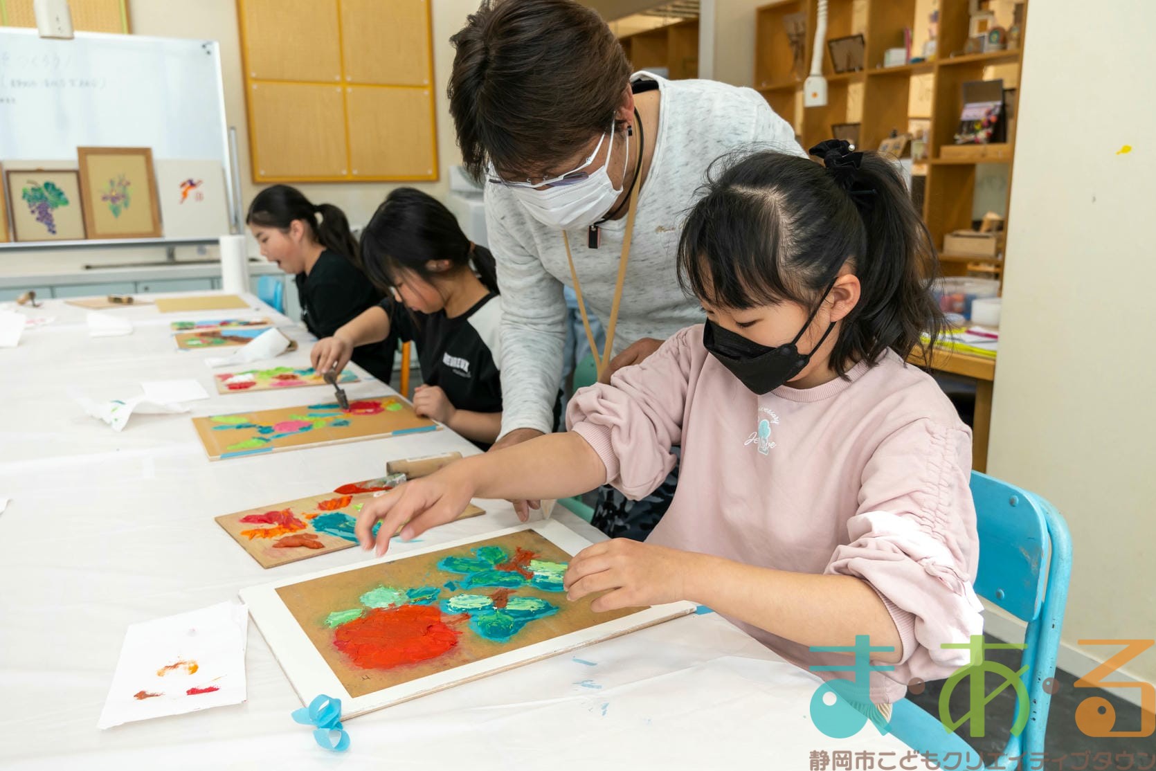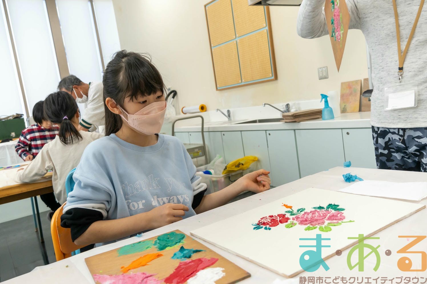 「思っていたより重いね」「ざらざらしてるね、砂が入っているのが分かる!」と、みなさん絵の具との違いも学ぶことができました。