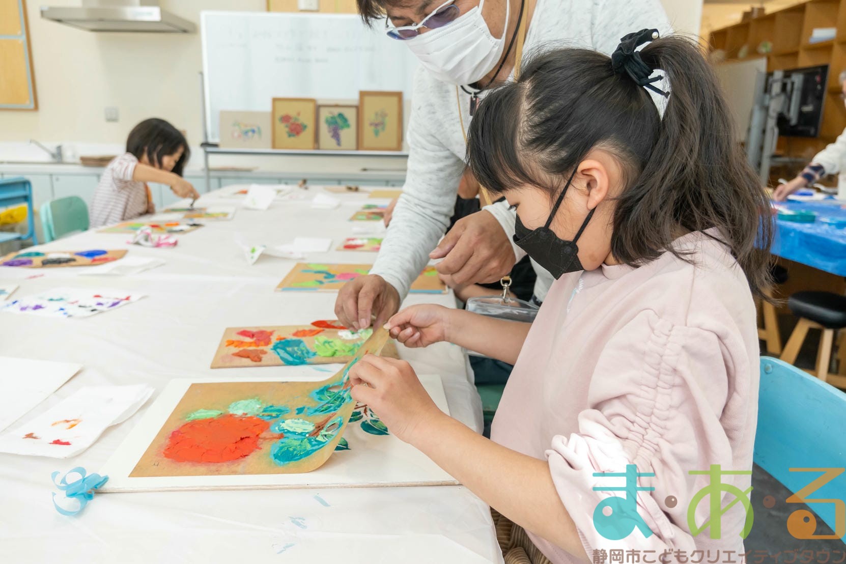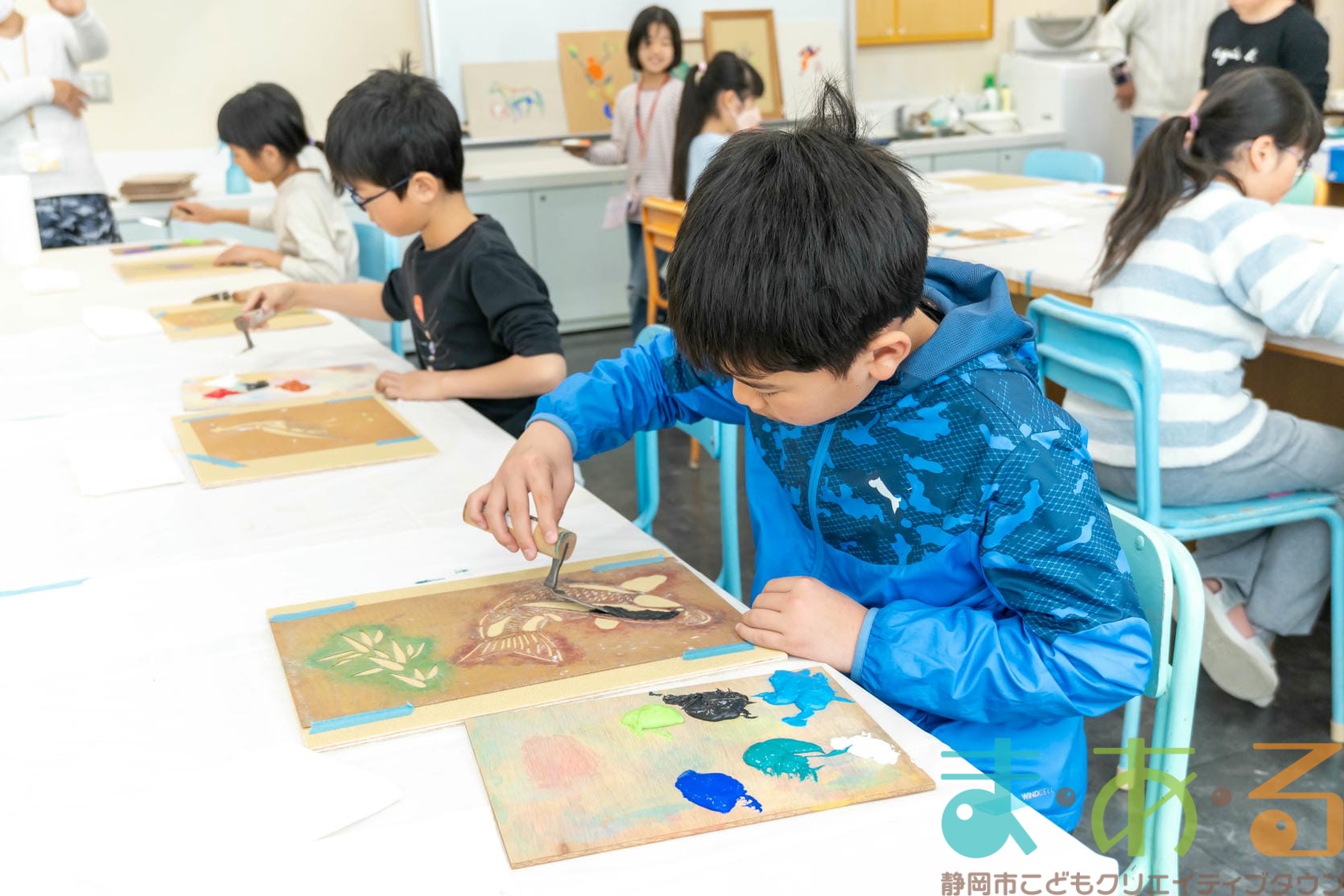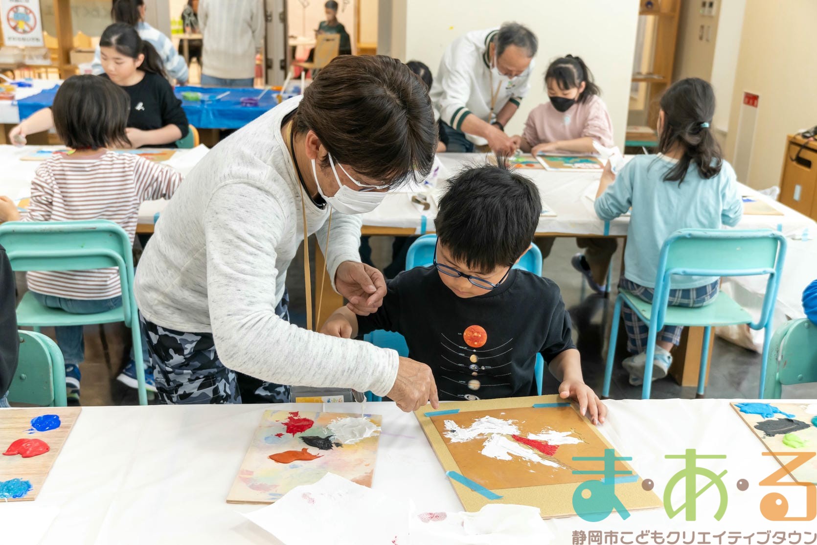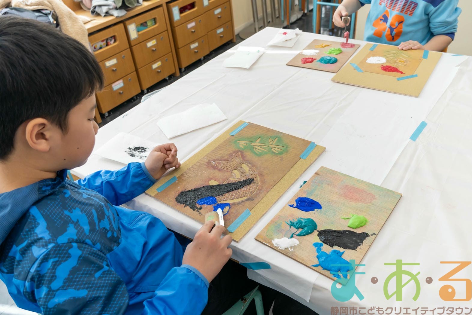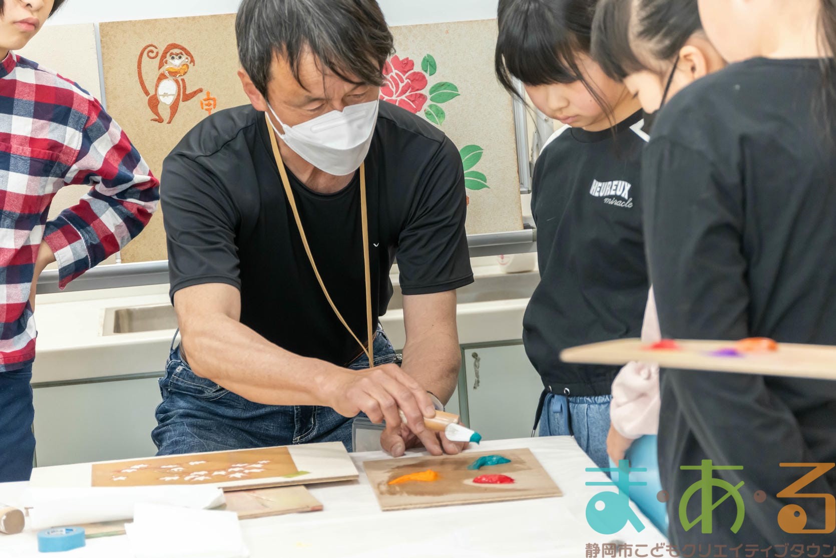 「思っていたより重いね」「ざらざらしてるね、砂が入っているのが分かる!」と、みなさん絵の具との違いも学ぶことができました。