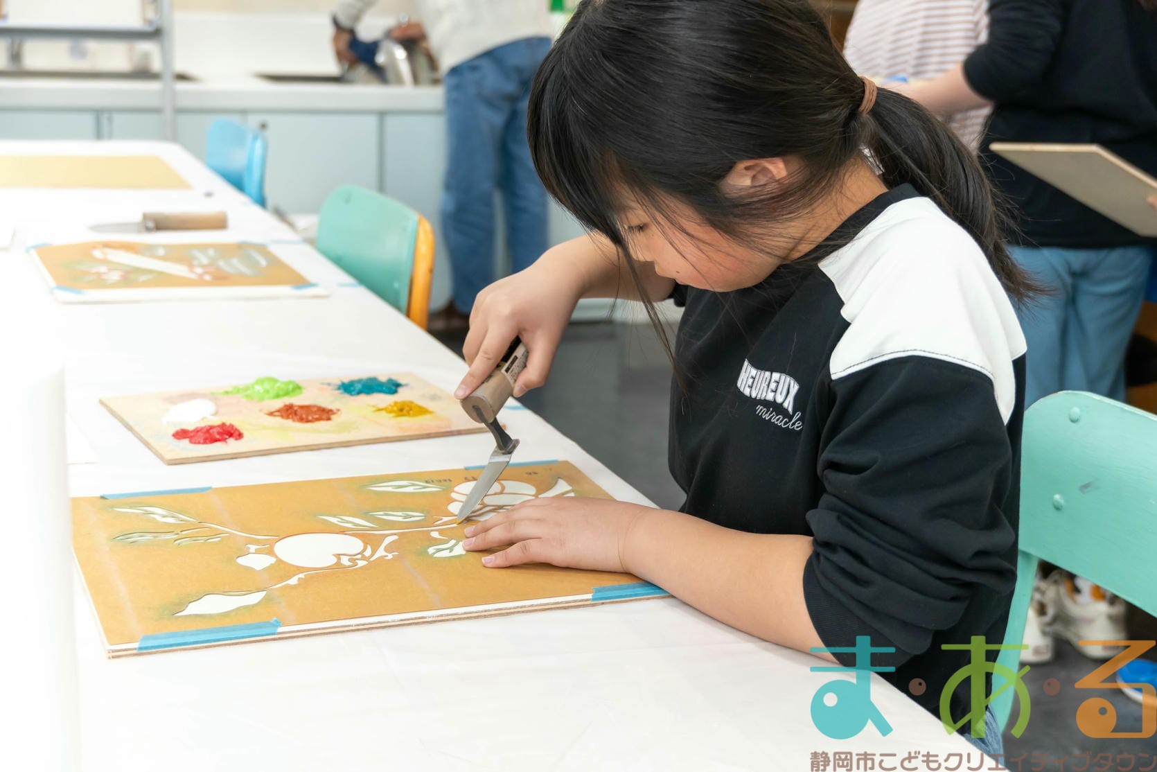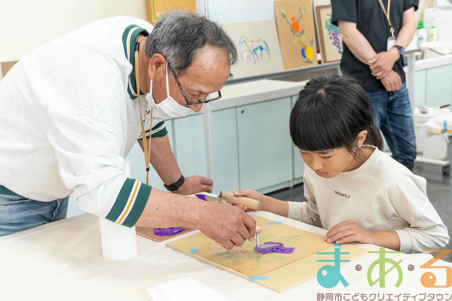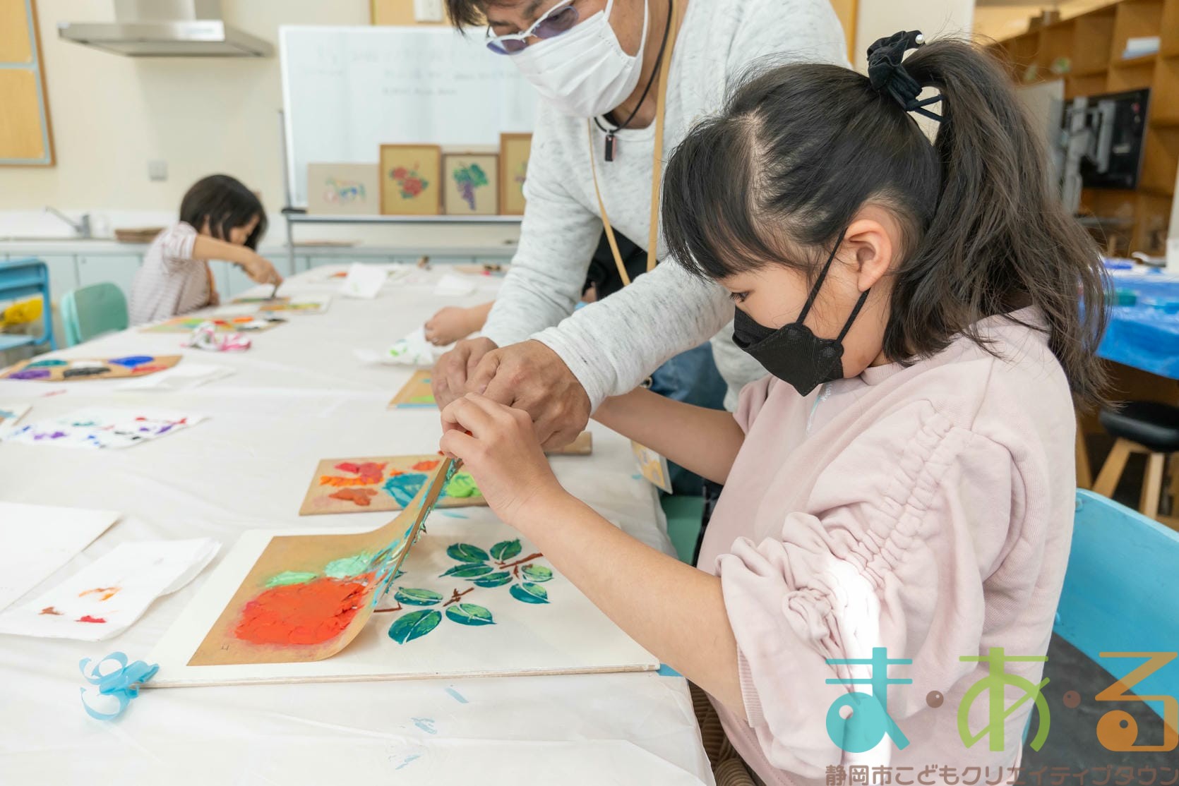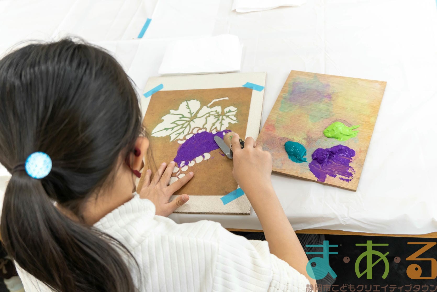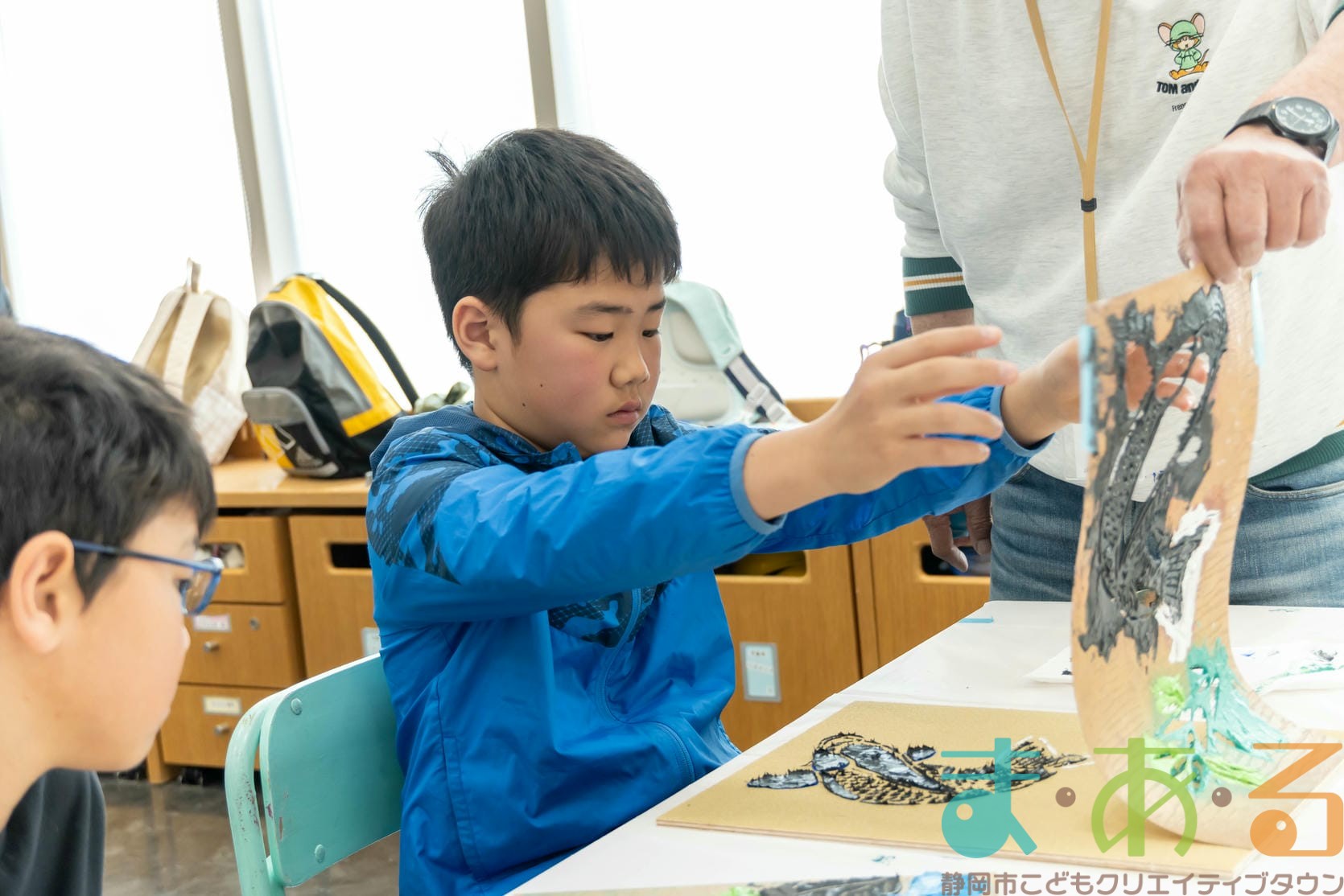 「思っていたより重いね」「ざらざらしてるね、砂が入っているのが分かる!」と、みなさん絵の具との違いも学ぶことができました。