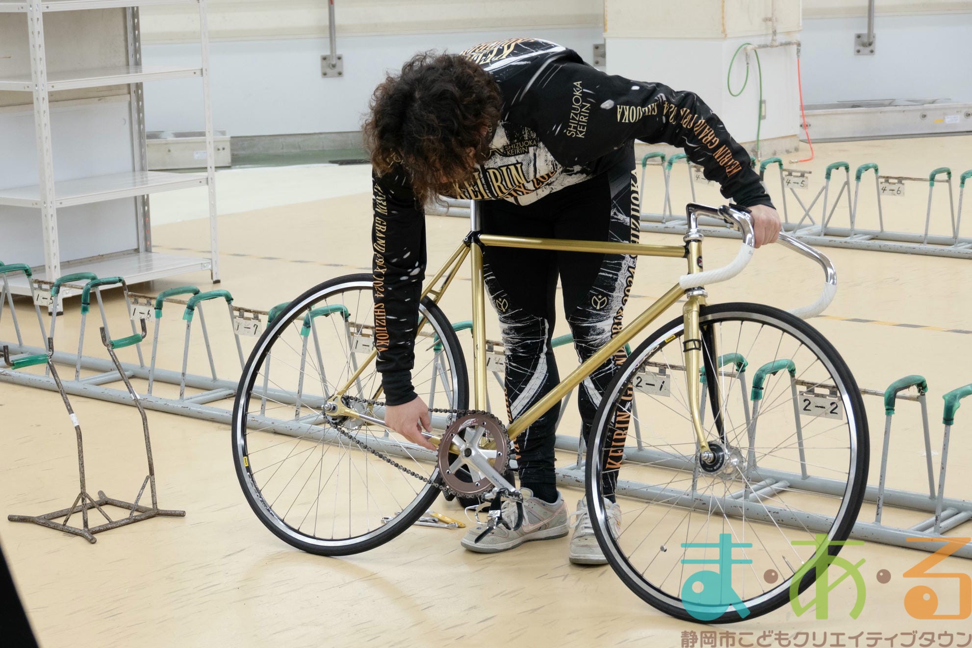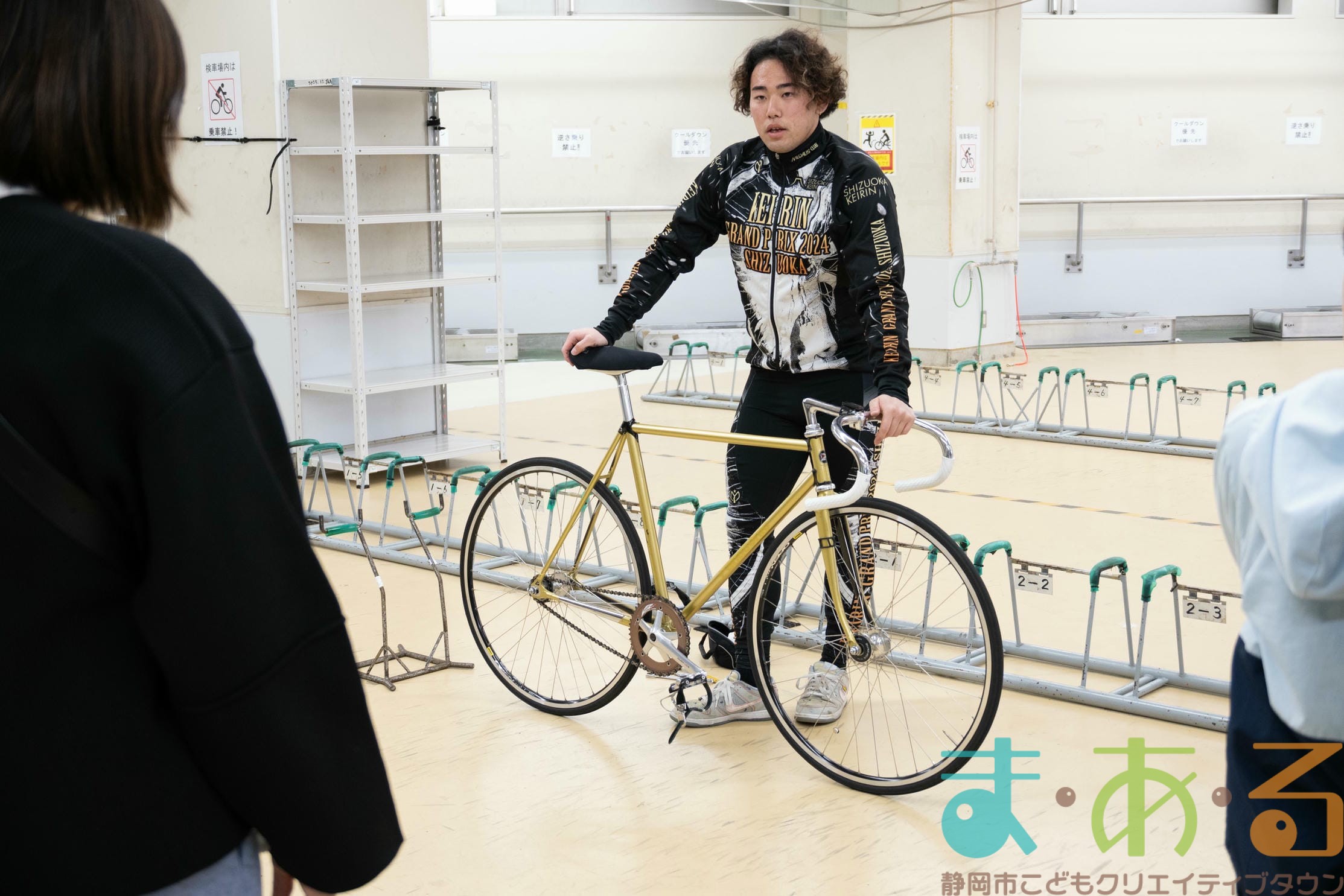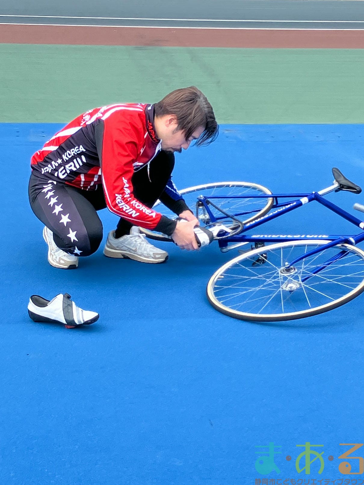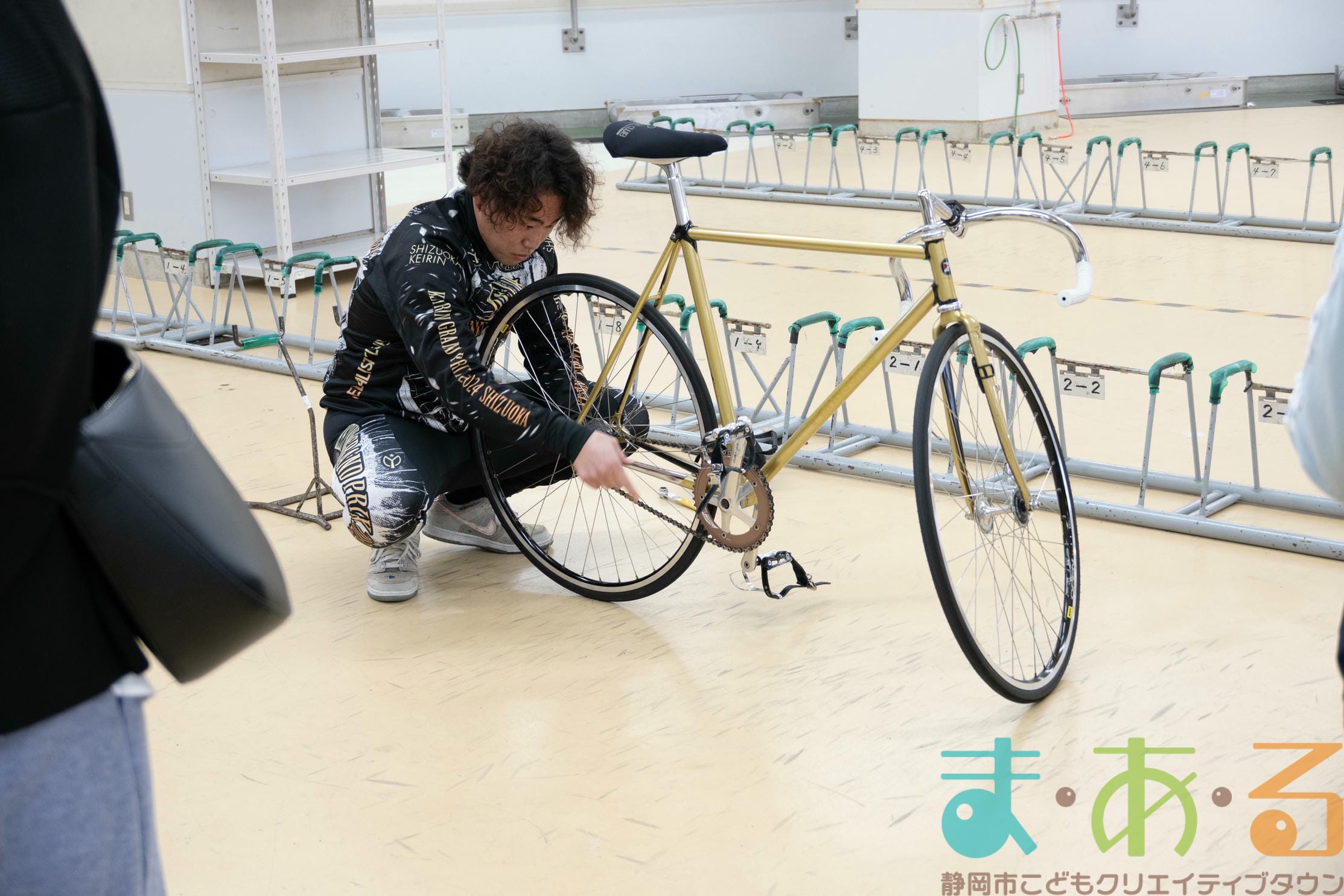 実際のレースで用いられる自転車ではなく、日々の練習で用いる自転車のためタイヤやホイールなどの部品が異なり、もう少し軽いそうですが、子どもでも軽々持ち上げられるほどの重さでした。