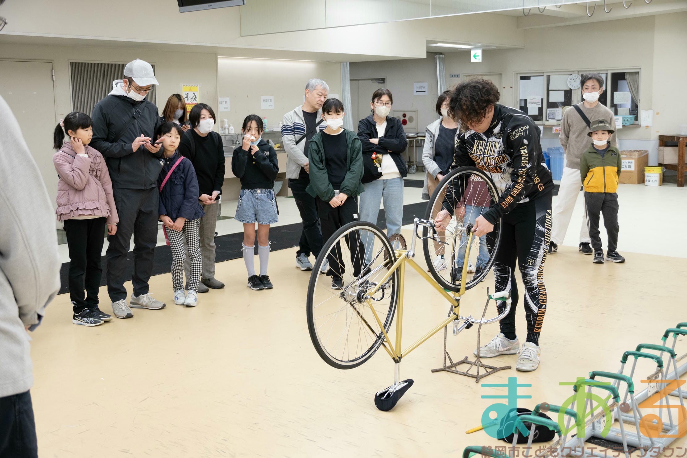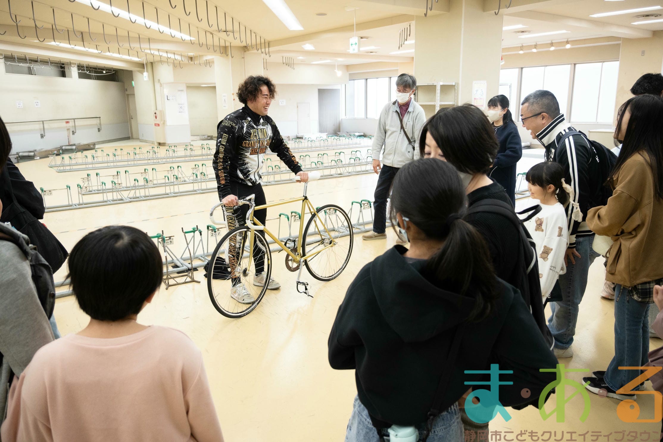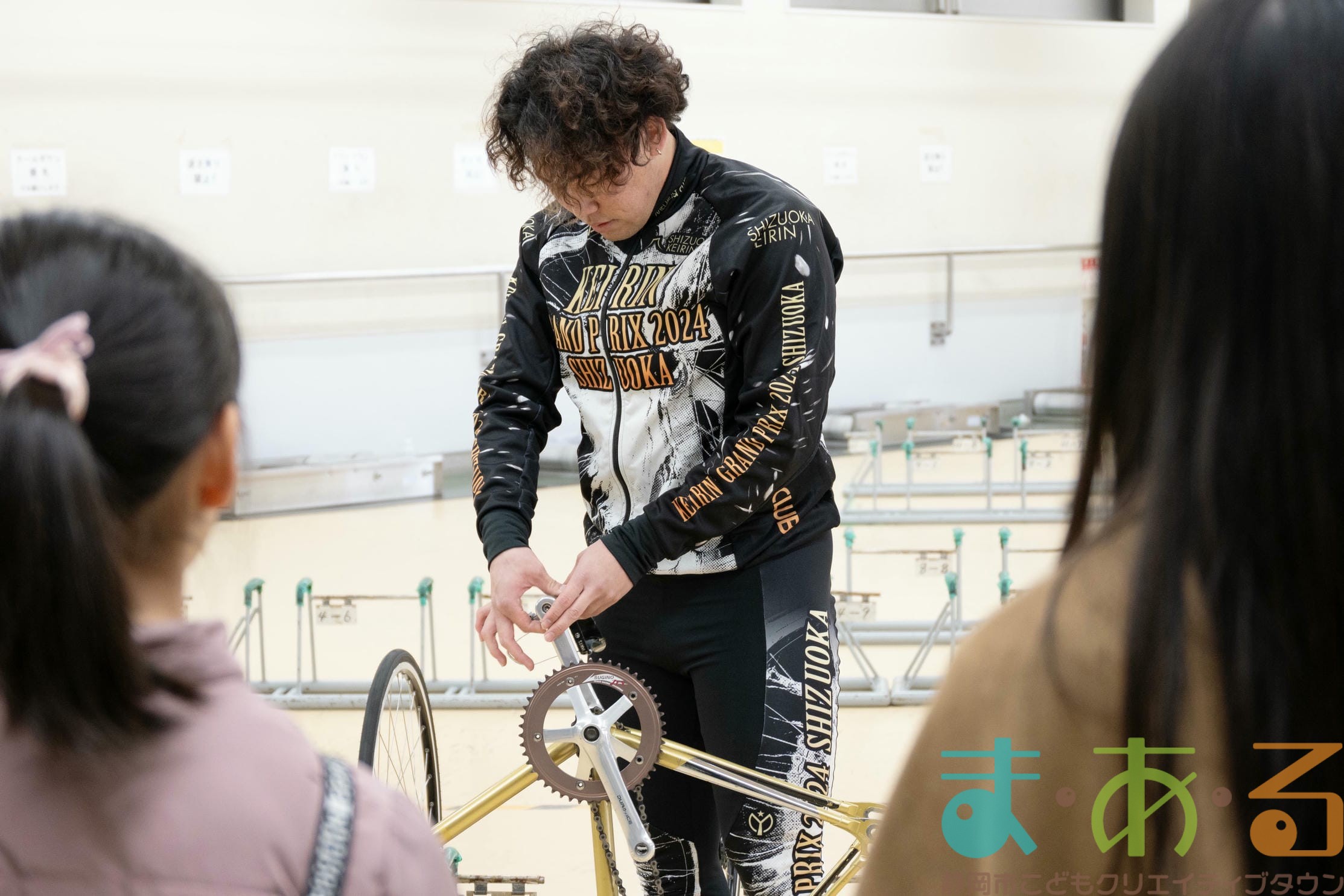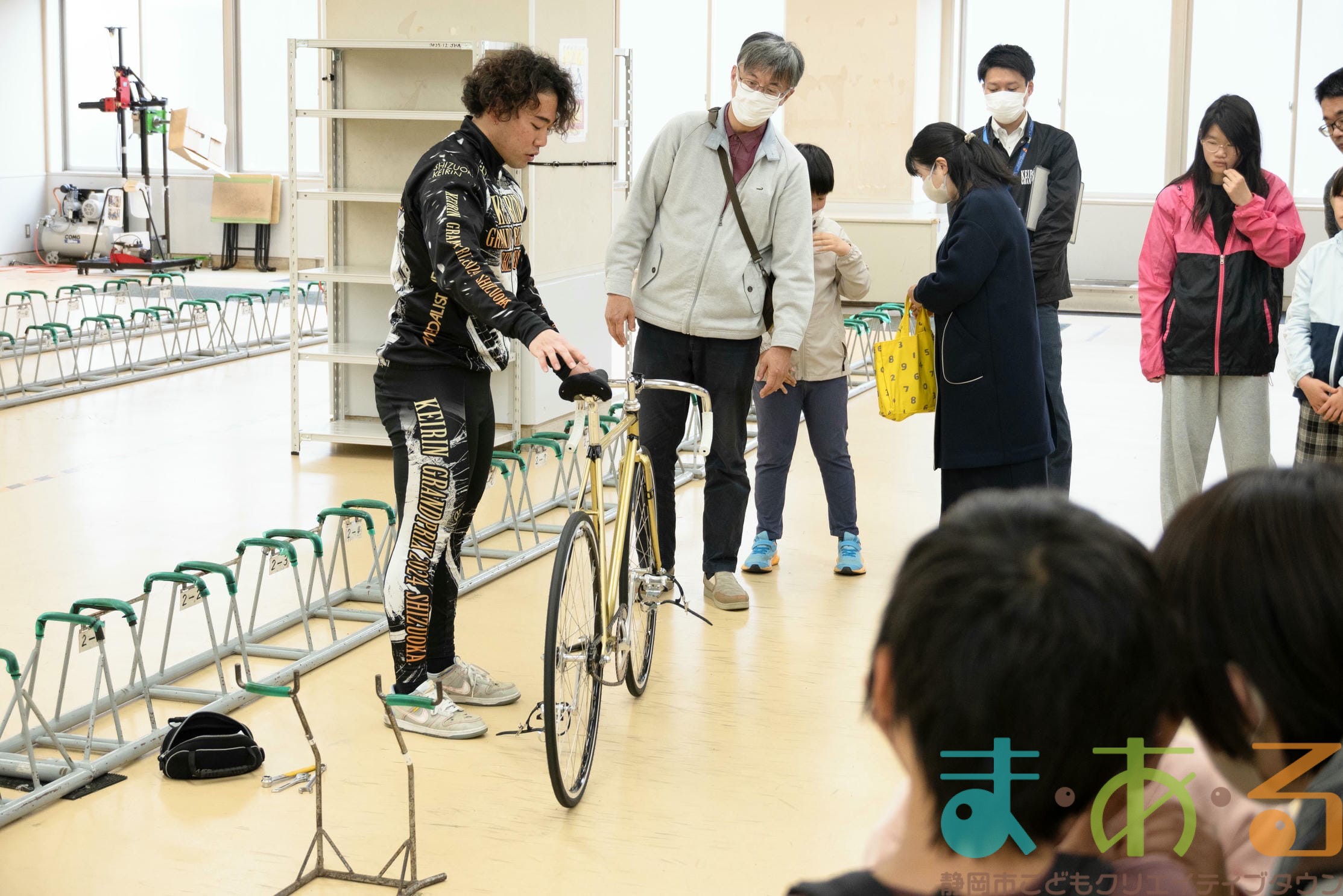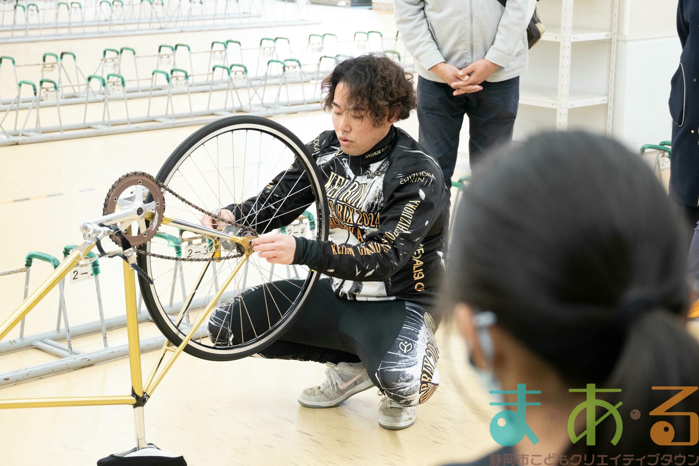 実際のレースで用いられる自転車ではなく、日々の練習で用いる自転車のためタイヤやホイールなどの部品が異なり、もう少し軽いそうですが、子どもでも軽々持ち上げられるほどの重さでした。