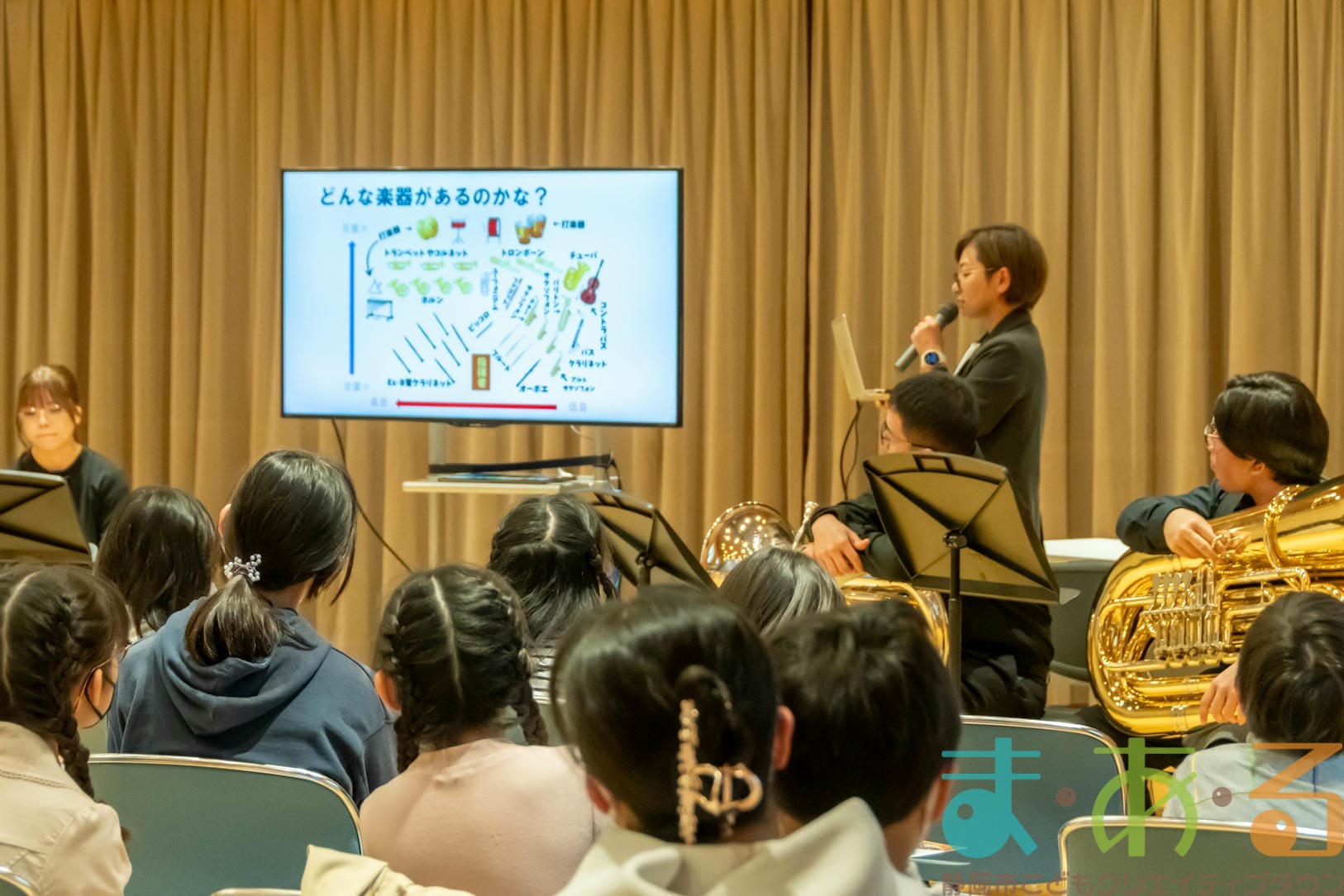 コンサートの前の貴重な時間をいただいて、楽器の紹介やコンサートの見どころなどを教えていただきます。