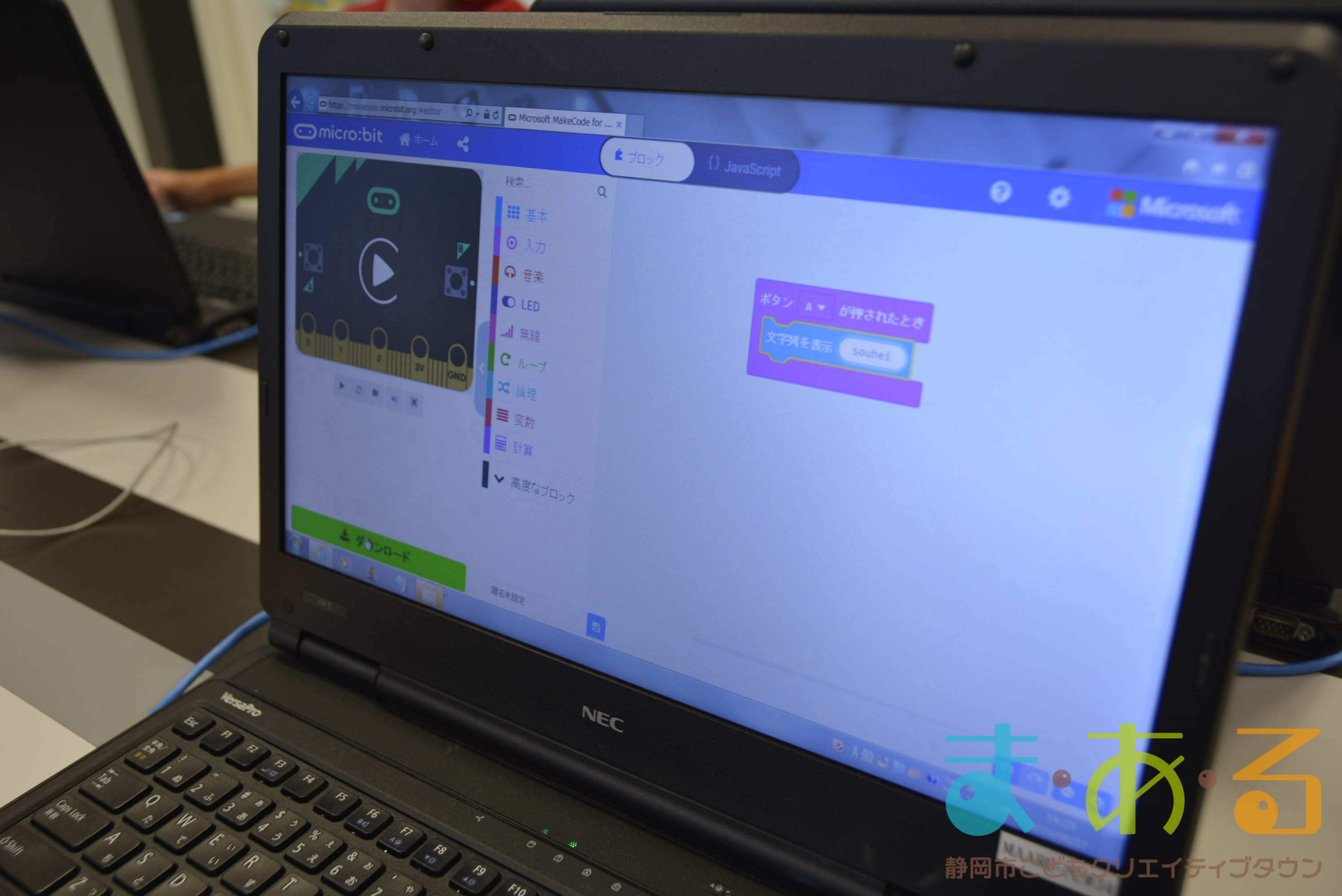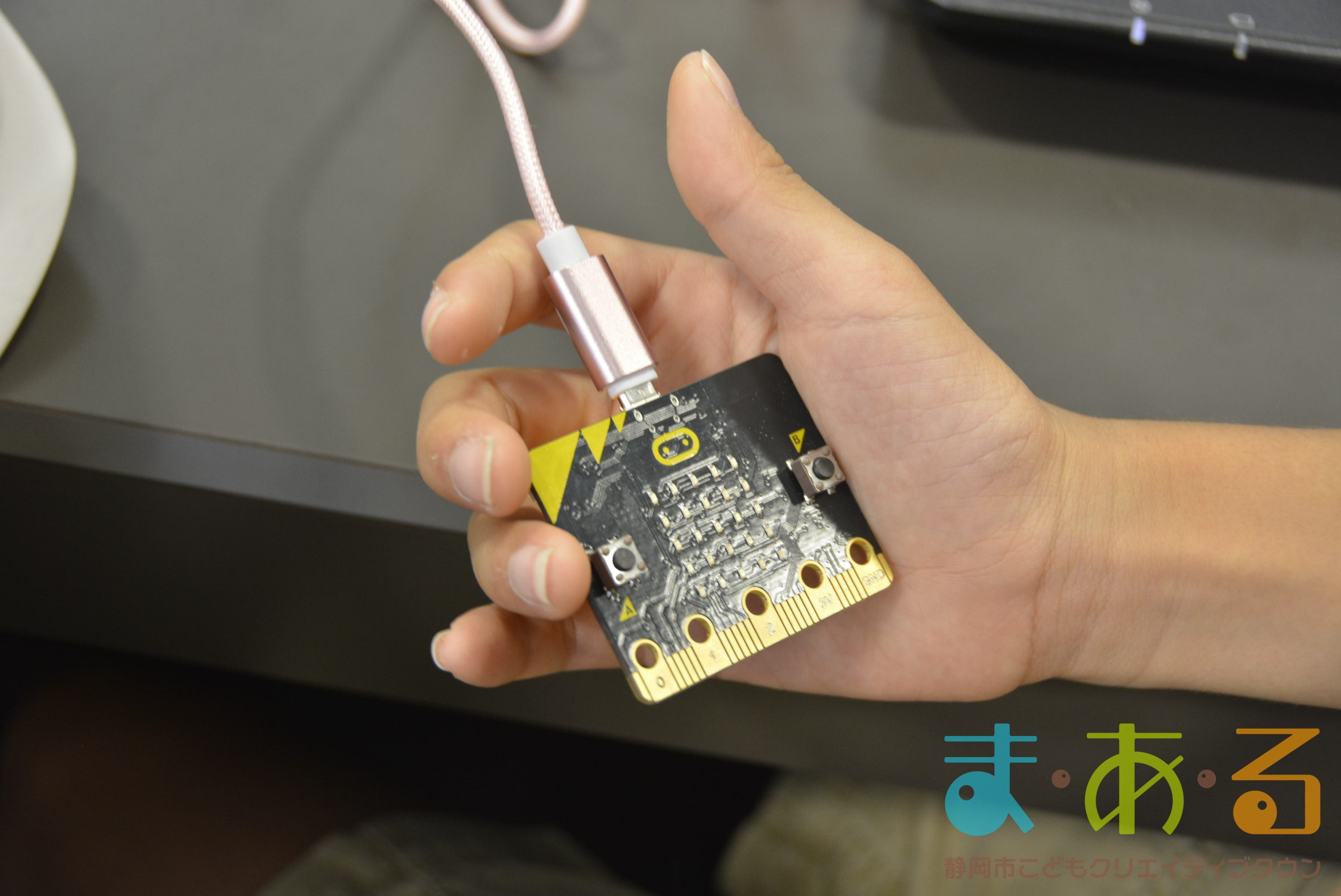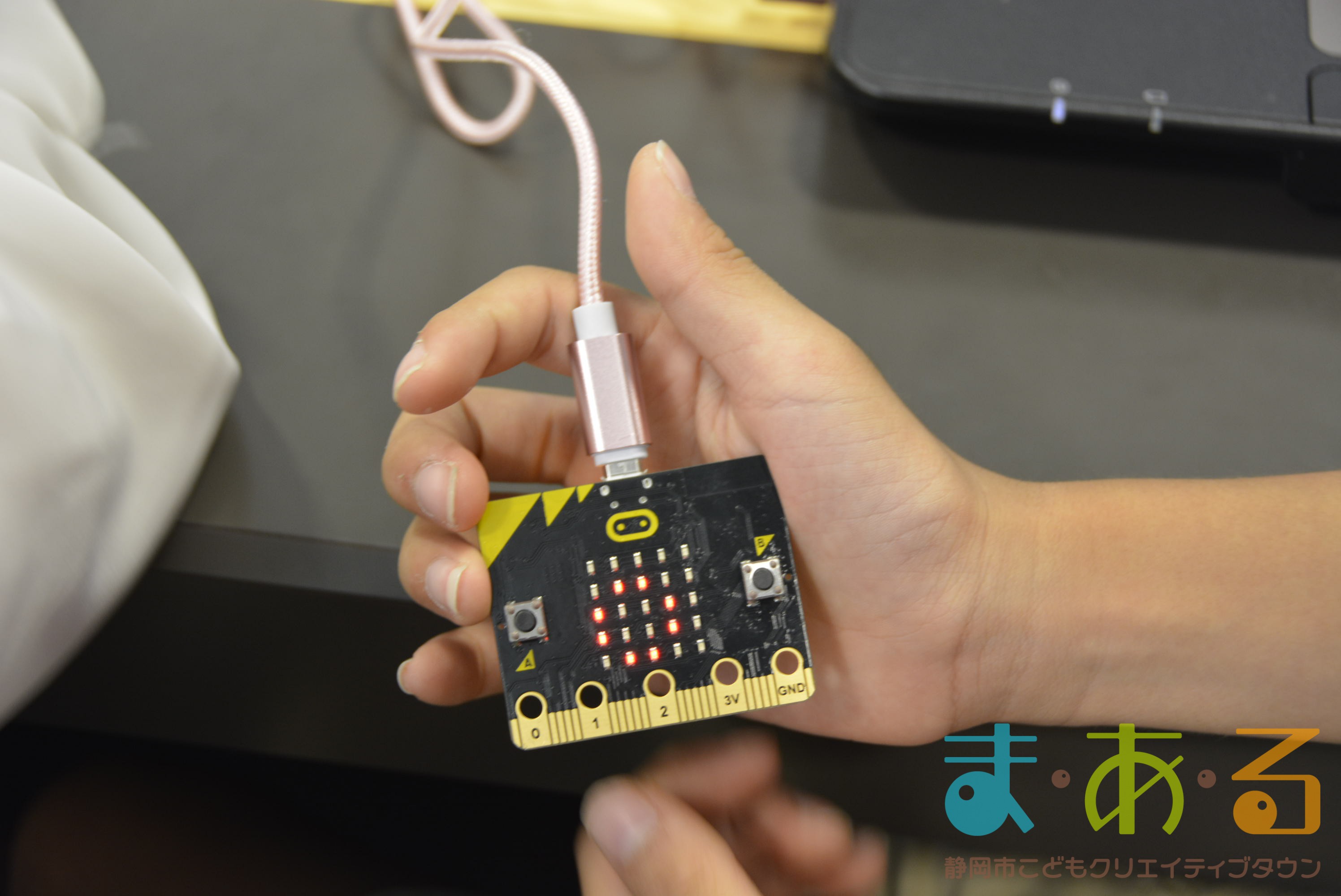 デジタル工房で行われたのは、「micro:bit」を使った講座です。「micro:bit」は、小さなコンピューターで、世界中でプログラミング教育に使われているものです。